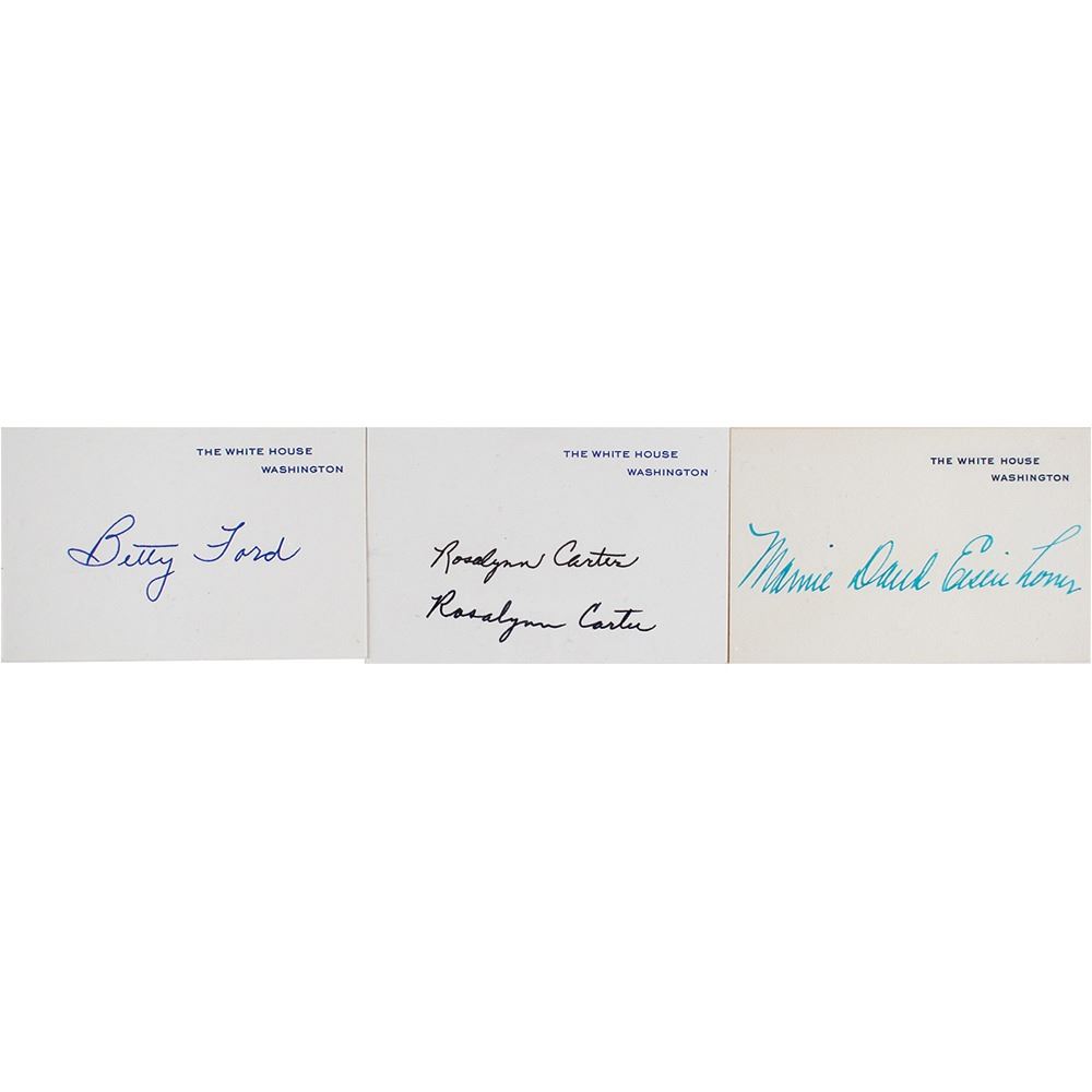 Three White House cards individually signed in ink or fountain pen by Betty Ford, Mamie Doud Eisenhower, and Rosalynn Carter, with the upper signature done in a secretarial hand. In overall fine condition. The Ford card is accompanied by the original White House transmittal letter addressed to Lionel Aucoin of Spencer, Massachusetts.