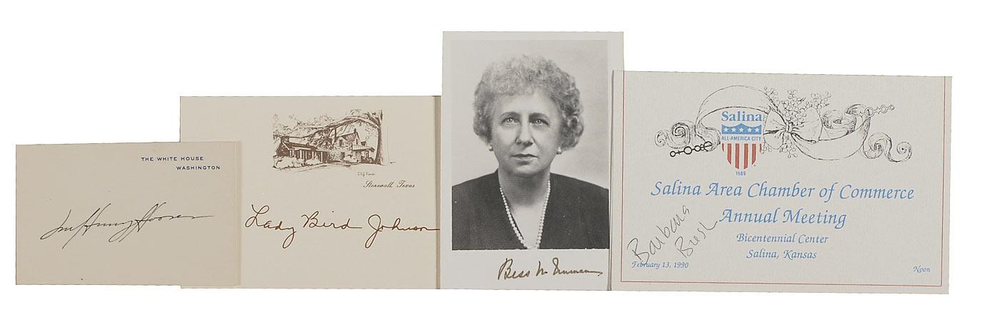 Four items: White House card signed in fountain pen by Lou Henry Hoover; LBJ Ranch card signed in ink by Lady Bird Johnson; cardstock photo of Bess Truman signed in felt tip; and a Salina Area Chamber of Commerce program signed in black ballpoint by Barbara Bush. In overall fine condition.