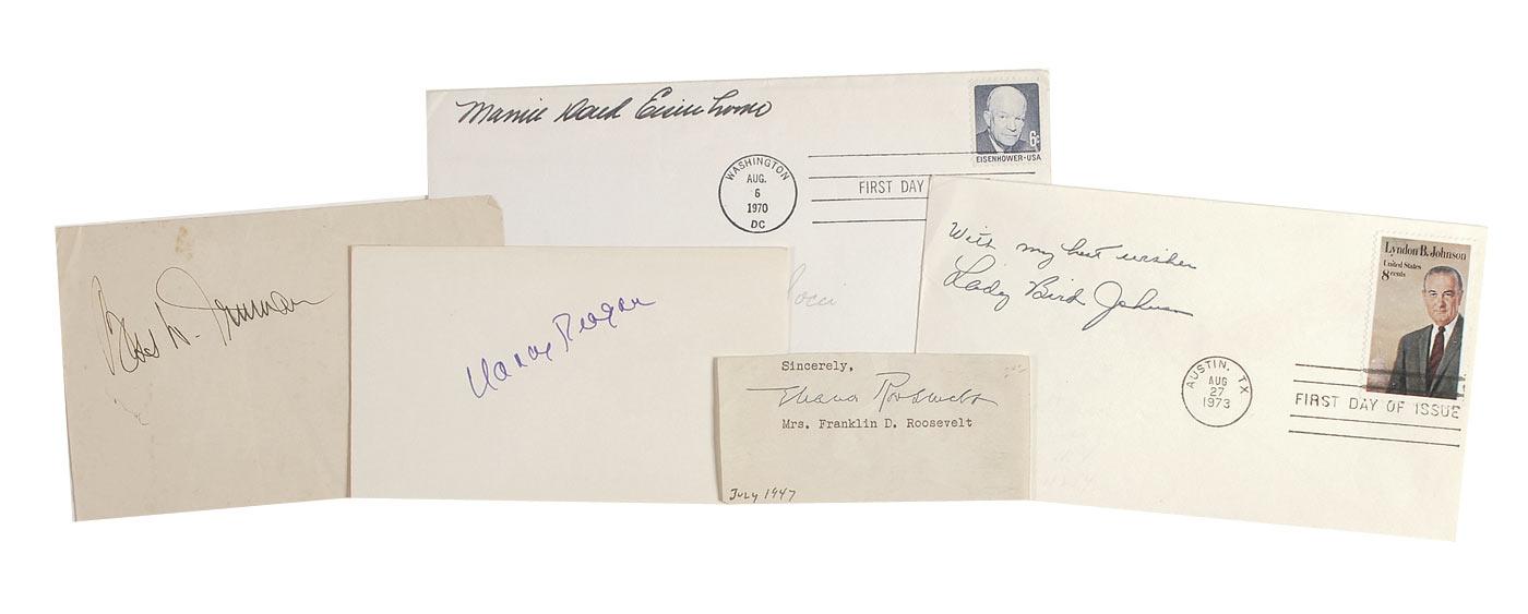 Five items: ink signatures, “Eleanor Roosevelt,” on an off-white 3.5 x 1.75 slip clipped from a larger letter, “Nancy Reagan” on an off-white 5 x 3 card, and “Bess W. Truman” on a 5.25 x 3.5; and two FDCs individually signed in black felt tip, “Mamie Doud Eisenhower” and “With my best wishes, Lady Bird Johnson.” In overall very good to fine condition with uniform toning, scattered creasing, wrinkling, a collector notation to Roosevelt’s signature, and creasing and a penciled address to the Eisenhower FDC.
