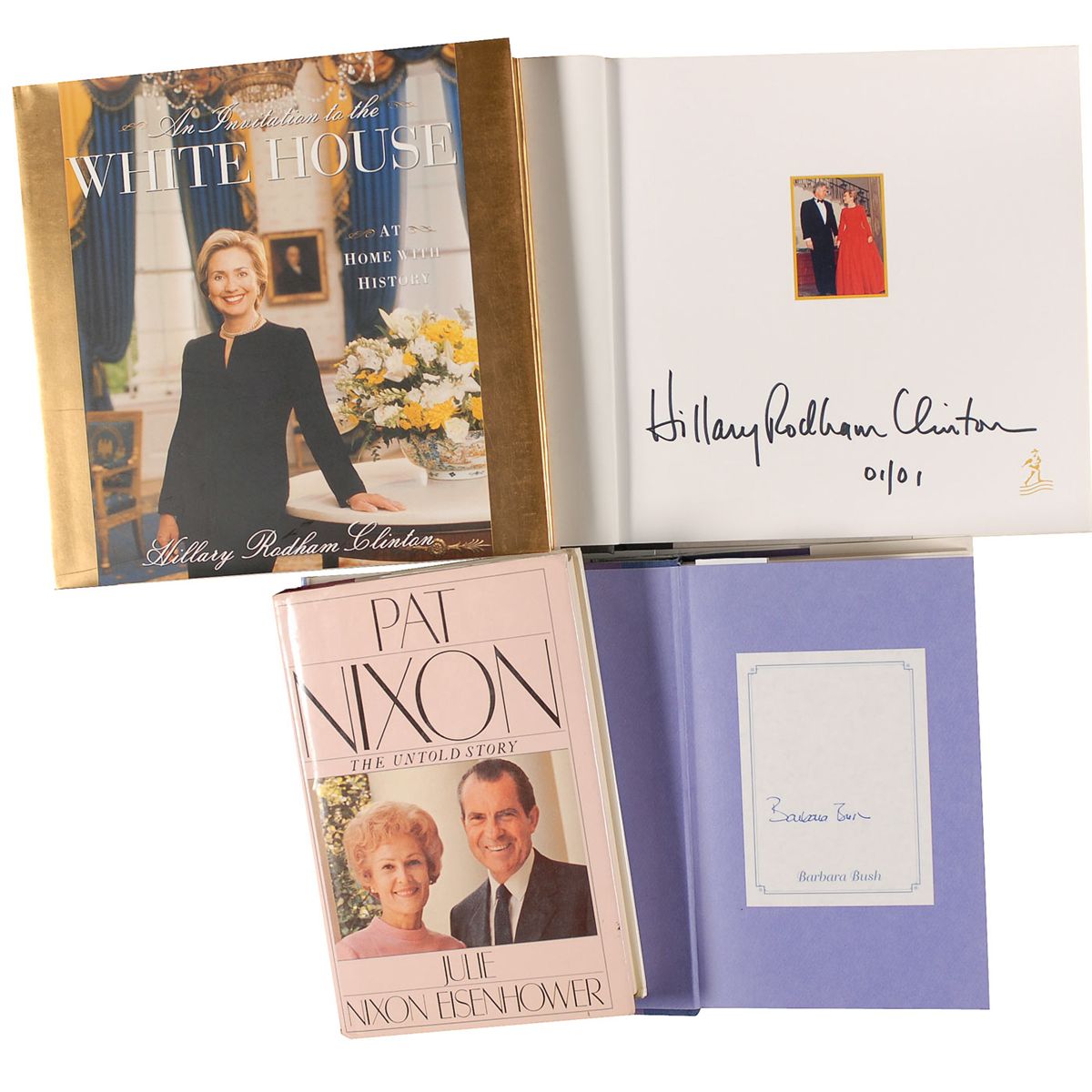 Four signed hardcover books: two copies of An Invitation to the White House, each signed on the second free end page by Hillary Rodham Clinton; Pat Nixon: The Untold Story, signed on a Richard Nixon Birthplace and Library bookplate affixed to the first free end page by Pat Nixon; and Barbara Bush: A Memoir, signed on a bookplate affixed to the first free end page. In fine overall condition.