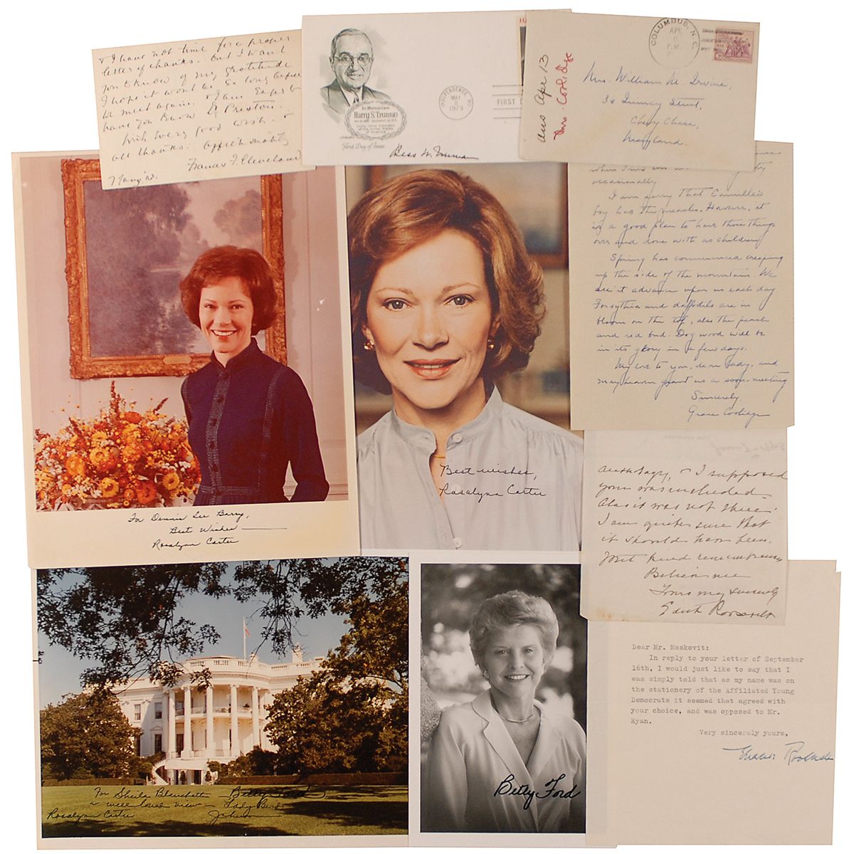 Ten items consisting of letters, photographs, and an FDC. ALSs from Edith Roosevelt, Frances Folsom Cleveland, and Grace Coolidge, which includes the original mailing envelope addressed in Coolidge’s hand. TLS from Eleanor Roosevelt on personal letterhead, regarding the Young Democrats. Glossy 5 x 7 photo of Betty Ford, signed in black felt tip. Two color 8 x 10 photos of Rosalynn Carter, each signed in black ink. Satin-finish color 9.75 x 8 photo of the White House, signed and inscribed in black ink by Lady Bird Johnson, Betty Ford, and Rosalynn Carter. FDC with cachet honoring Harry Truman, signed by Bess Truman. In very good to fine condition.