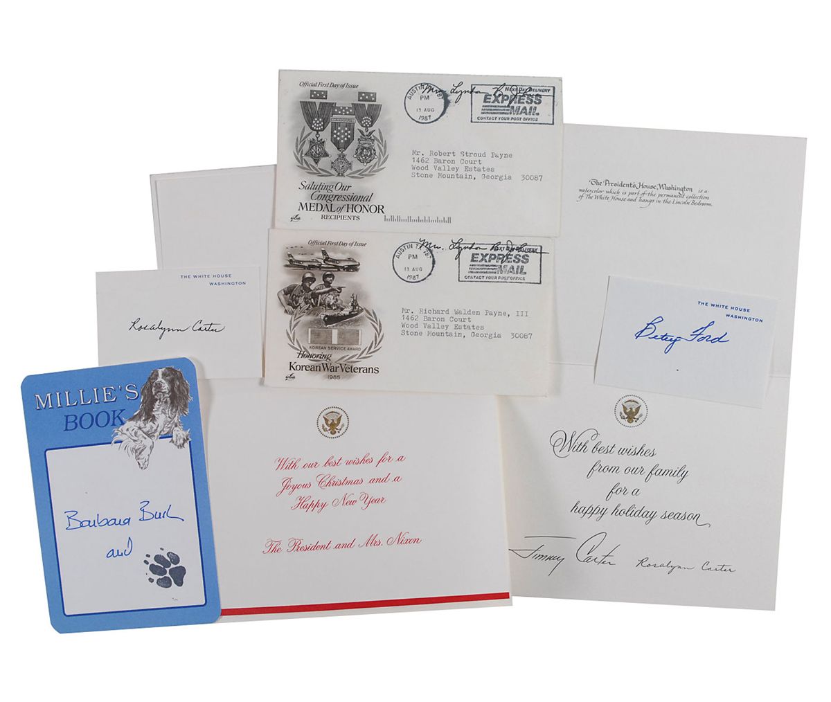 Five items: two commemorative covers, each franked in the upper right by Lady Bird Johnson; two mock White House cards signed in blue felt tip by Betty Ford; and a bookplate signed in blue felt tip by Barbara Bush. In overall fine condition. Accompanied by two unsigned presidential Christmas cards.