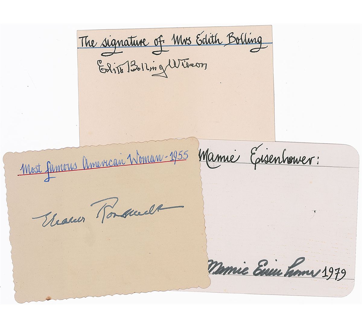 Ink signatures, “Edith Bolling Wilson,” “Eleanor Roosevelt,” and “Mamie Eisenhower,” on individual off-white cards. In overall fine condition.