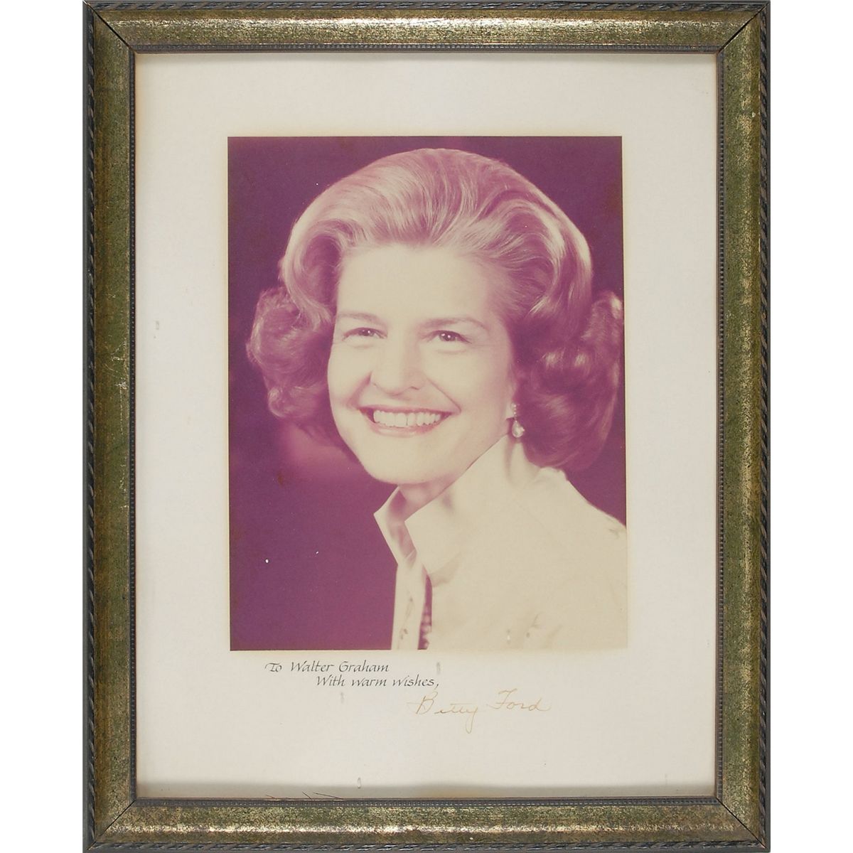 Two uncommon oversized portraits: a matte-finish 7 x 10.5 three-quarter-length portrait of Grace Coolidge, signed and inscribed along the bottom in significantly faded black ink; and a color 7.5 x 9.5 head-and-shoulders portrait of Betty Ford affixed to a larger mount, signed on the mount by Ford and inscribed in a calligraphic hand. Photos are individually framed to overall sizes of 12 x 16. In overall very good condition, with aforementioned heavy fading to Coolidge’s signature.