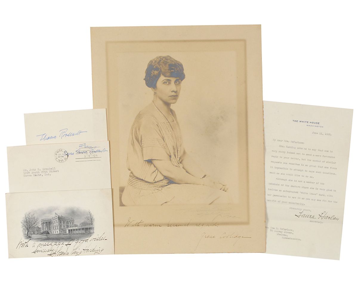 Nice collection of four items, each signed by a first lady, including: Eleanor Roosevelt (free frank and signature), Florence Kling Harding (engraving), and Grace Coolidge (oversized SP). In overall fine condition. Accompanied by a letter of transmittal from Harding’s secretary.
