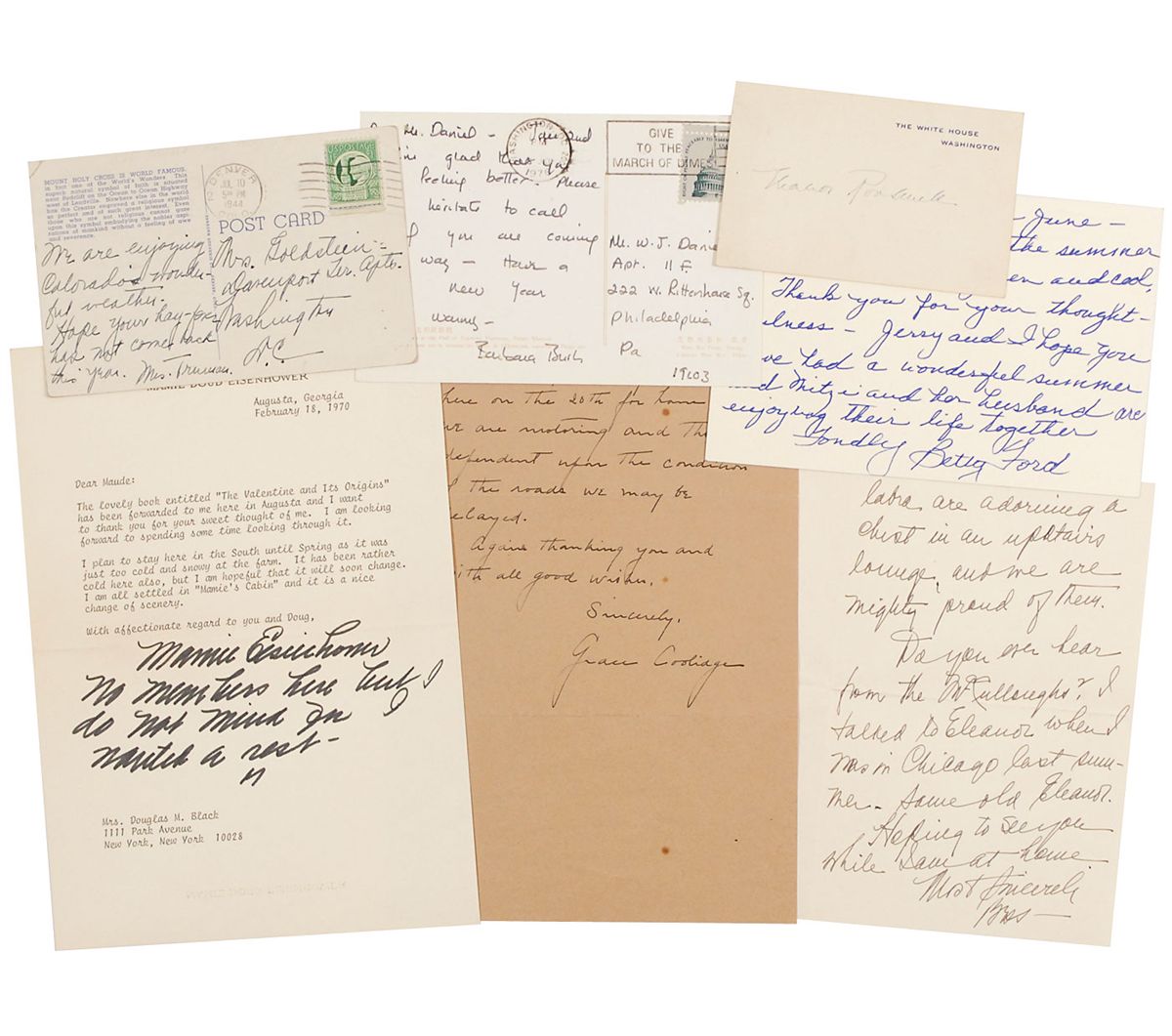 Collection of seven items with an uncommon variety of formats, each signed by a first lady, including: Grace Coolidge (ALS), Eleanor Roosevelt (White House card), Bess Truman (2 ALSs), Mamie Doud Eisenhower (TLS), Betty Ford (ALS), and Barbara Bush (ALS). In overall fine condition. The Ford letter and one Truman letter are accompanied by their original mailing envelopes, addressed in the first lady’s hand.