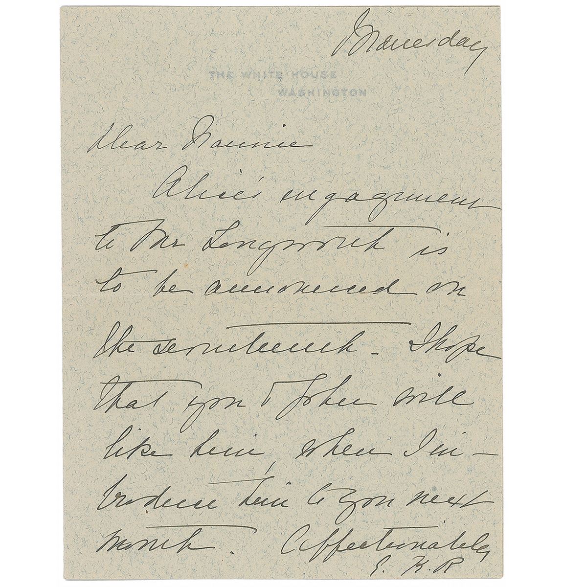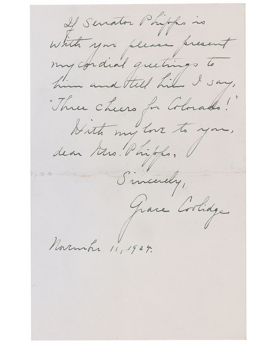 Nice collection of four letters, each signed by a first lady, including: Eleanor Roosevelt (TLS), Grace Coolidge (ALS on White House letterhead), and Edith K. Roosevelt (two ALSs, both on White House letterhead). In overall fine condition. The Eleanor letter is accompanied by the original mailing envelope and a Western Union telegram and envelope.