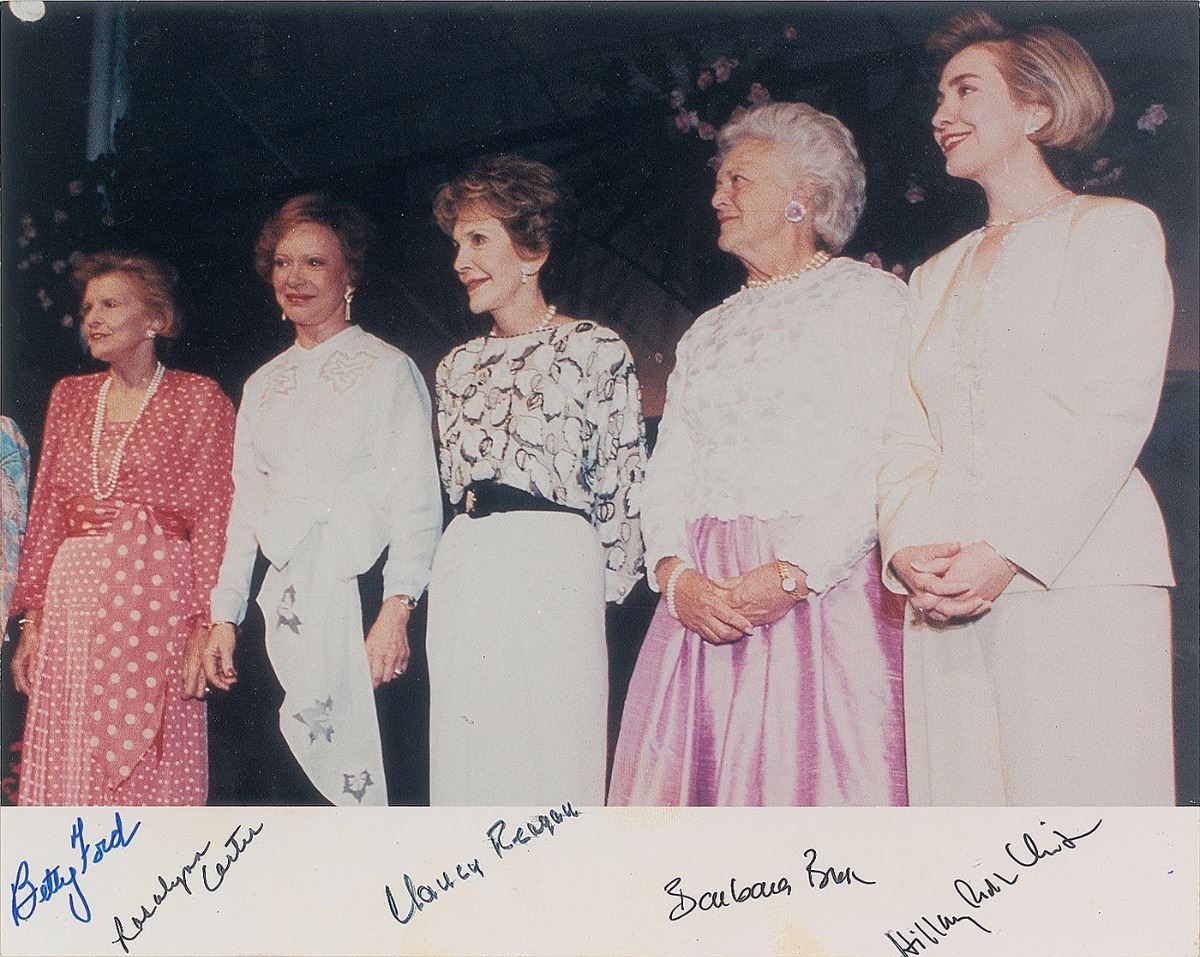 Color glossy 10 x 8 photo of five first ladies together, signed in the lower border in felt tip by Betty Ford, Rosalynn Carter, Nancy Reagan, Barbara Bush, and Hillary Rodham Clinton. In fine condition, with a tiny stain to the bottom edge. An uncommon grouping of five of America’s most influential female figures.