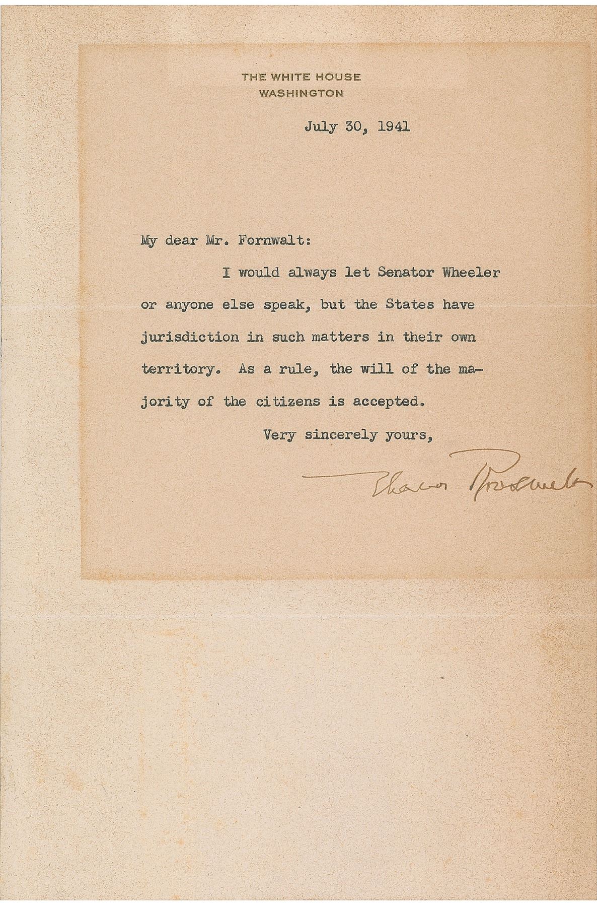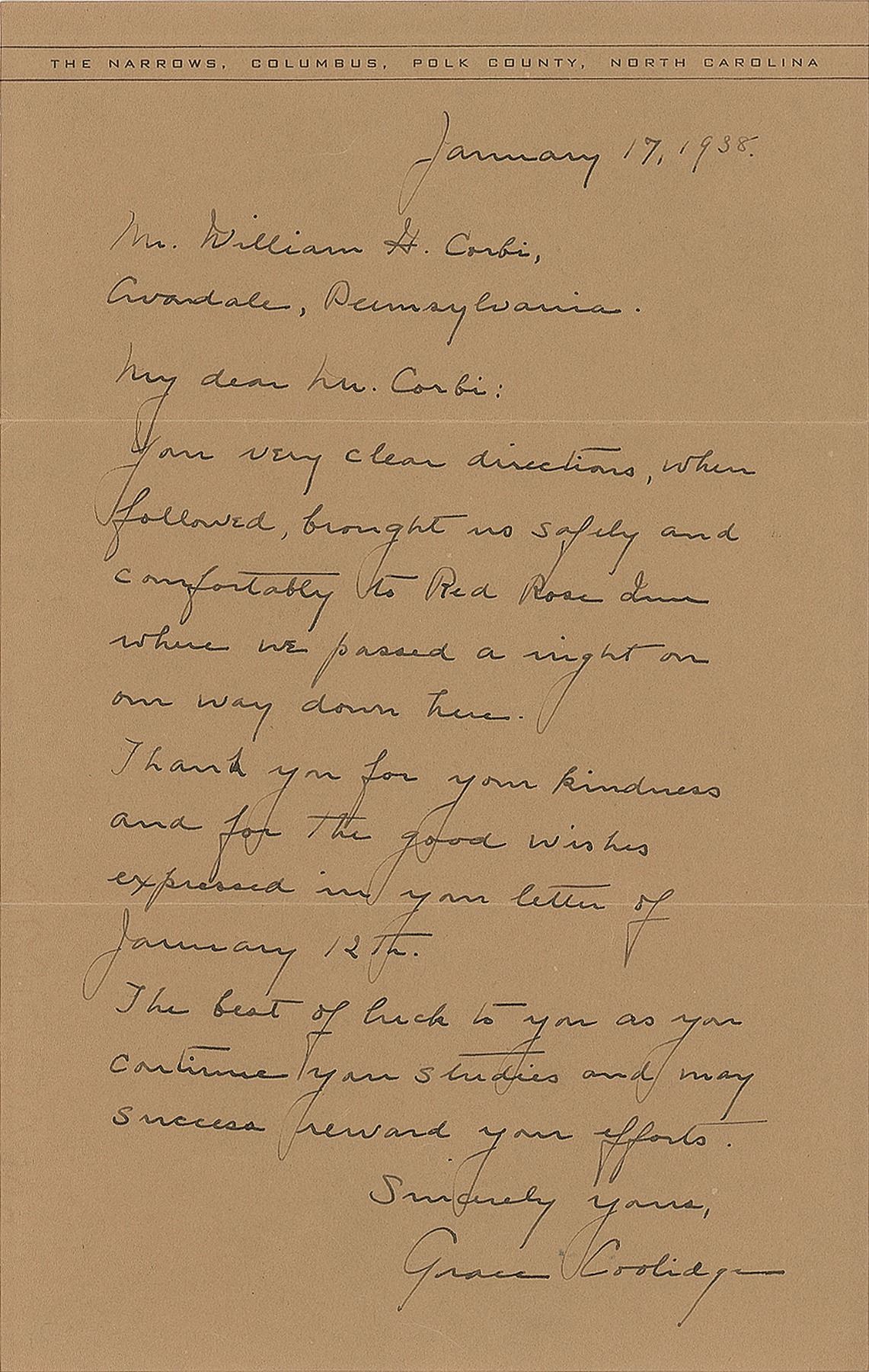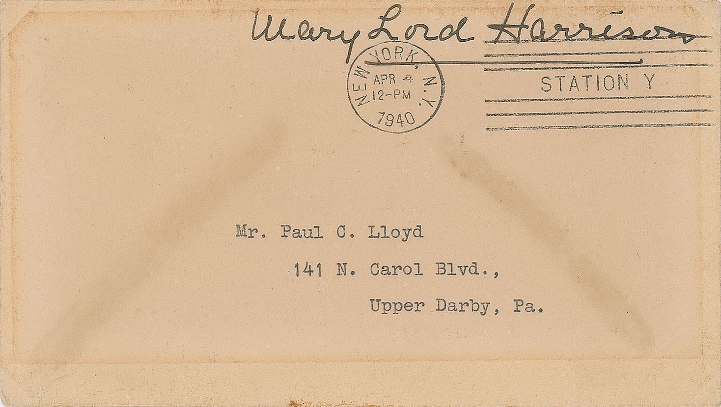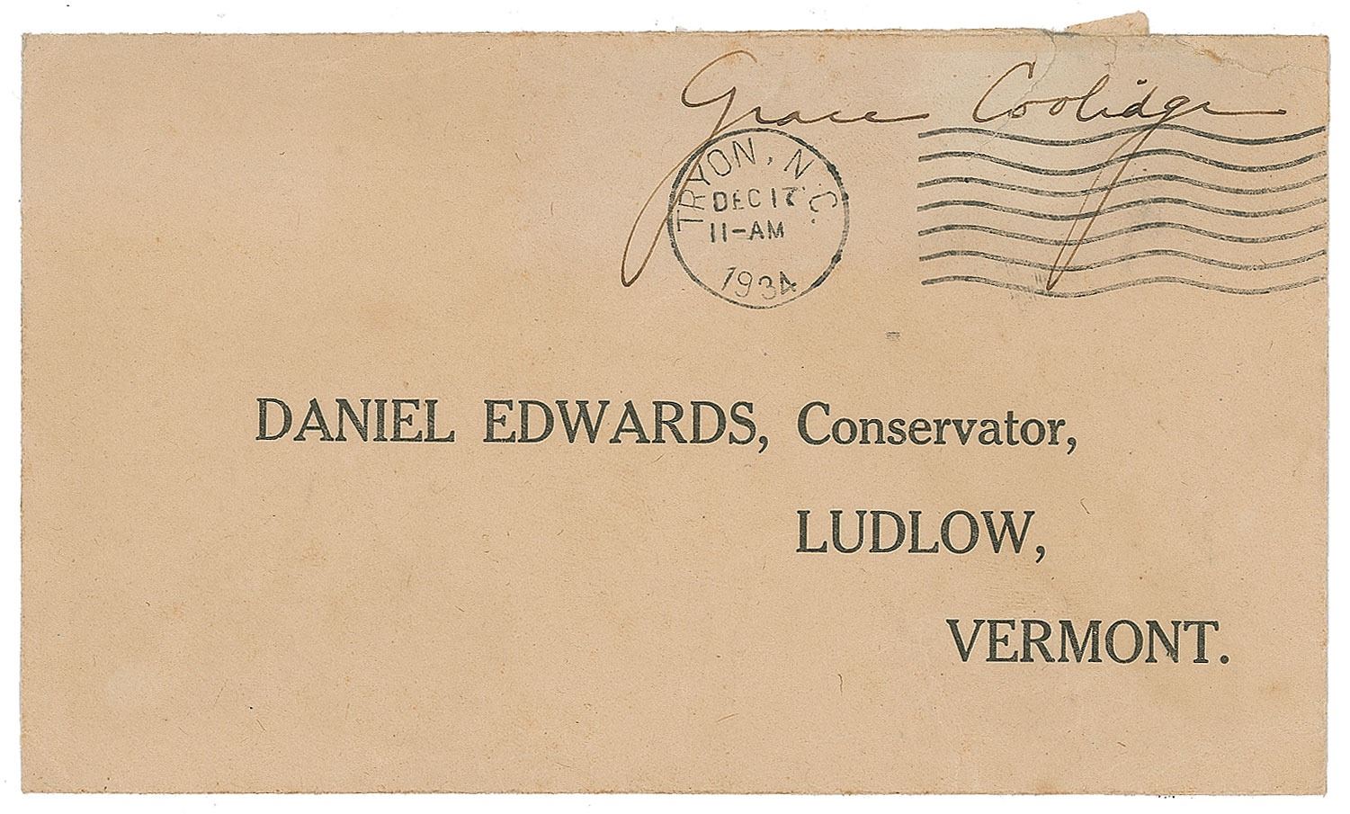 Appealing lot of four items, each signed by a first lady, including: Eleanor Roosevelt (ALS on White House letterhead), Grace Coolidge (2; ALS and free franked envelope), and Mary Lord Harrison (free franked envelope). In overall very good to fine condition, with toning to Roosevelt from prior display.