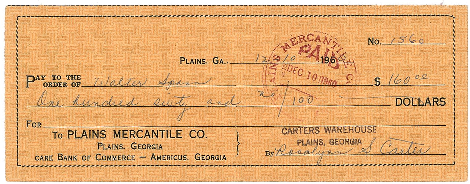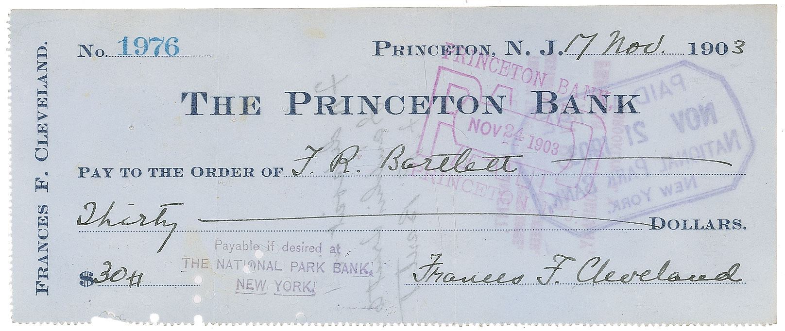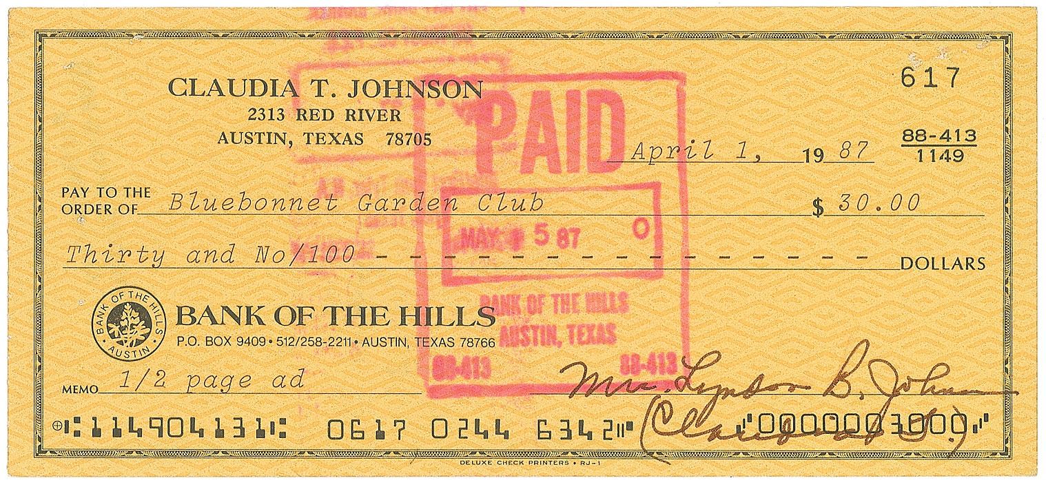 Group of three checks signed by former residents of the White House: a 1903 personal check filled out and signed by Frances Cleveland, "Frances F. Cleveland"; a 1987 personal check filled out in type and signed by Lady Bird Johnson, "Mrs. Lyndon B. Johnson, (Claudia T.)"; and a 1960 Plains Mercantile Co. check, filled out and signed by Rosalynn Carter, "Rosalynn S. Carter." In overall fine condition.