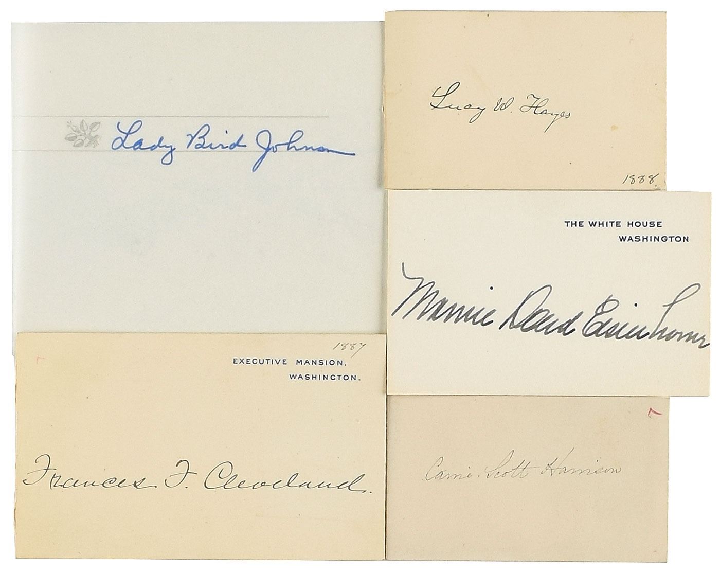 Group lot of five ink or fountain pen signatures from a former first lady on off-white sheets or cards ranging in size from 3.5 x 2 to 5 x 4, including: Frances Cleveland (Executive Mansion card), Mamie Doud Eisenhower (White House card), Caroline Harrison, Lucy Webb Hayes, and Lady Bird Johnson. In overall fine condition.