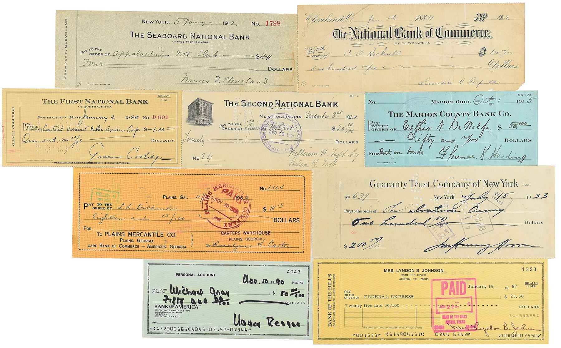 Group lot of eight checks signed by a former first lady of the United States, ranging in size from 6 x 2.75 to 8.5 x 3.25, dated between 1891 and 1990, all but one filled out by a first lady, including: Lucretia Garfield, Frances Cleveland, Florence Harding, Helen Taft, Lou Henry Hoover, Grace Coolidge, Rosalynn Carter, Lady Bird Johnson (filled out in type, signed "Mrs. Lyndon B. Johnson"), and Nancy Reagan. In overall fine condition.