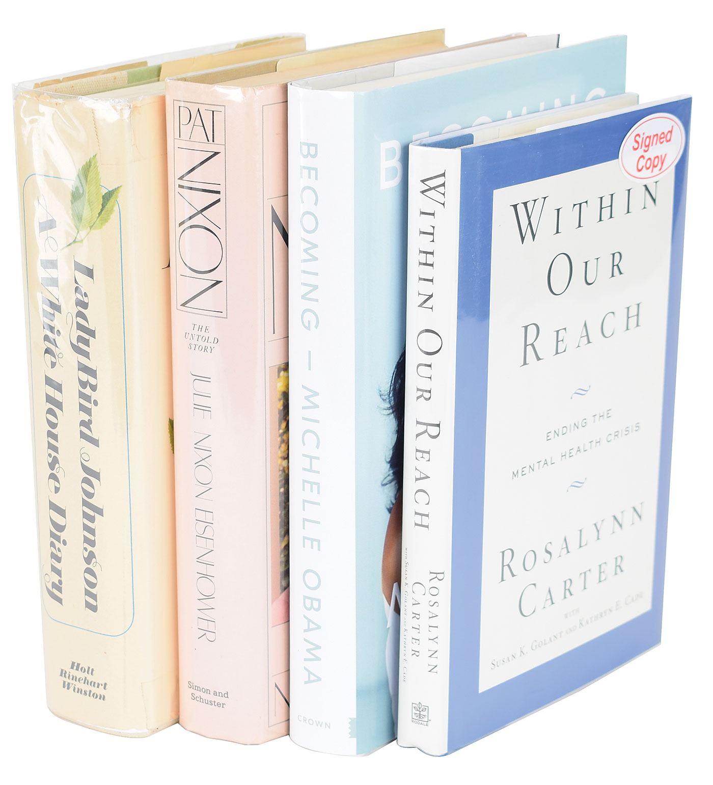 Four books signed by members of America's first families, including three first ladies, all hardcovers with dust jackets, including: Michelle Obama (Becoming); Lady Bird Johnson (A White House Diary); Rosalynn Carter (Within Our Reach); and Julie Nixon Eisenhower (Pat Nixon: The Untold Story). In overall fine condition, with corner creasing to some of the middle pages in the Obama book.
