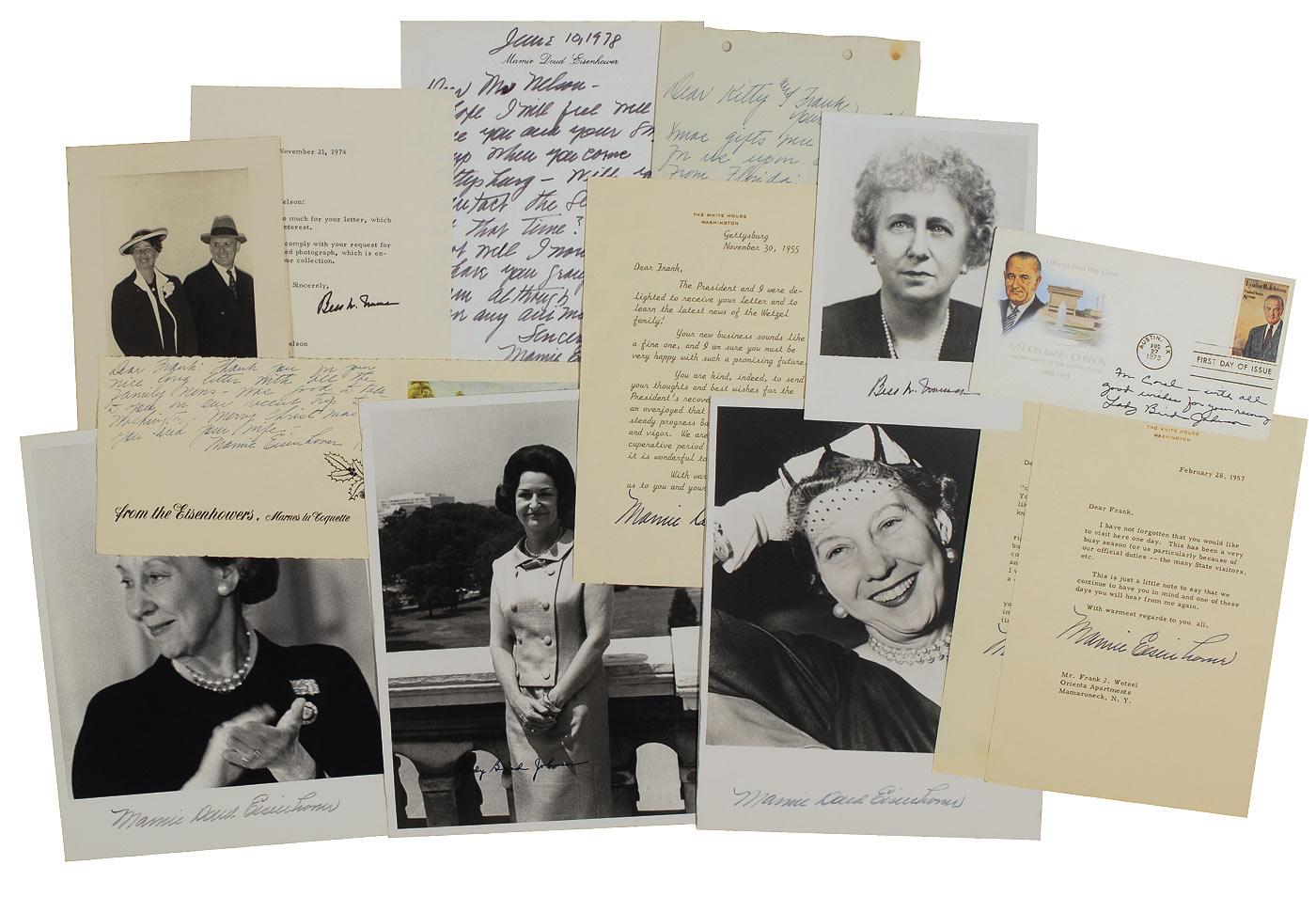 Collection of 13 items consisting of letters, photos, and an FDC, each signed in ink or felt tip by a First Lady. Items are: a vintage 5 x 7 photo of Eleanor Roosevelt, signed in black ink; a cardstock 5 x 7 photo of Bess Truman, signed in black felt tip as well as a one page TLS from 1974; a glossy 8 x 10 photo of Lady Bird Johnson, signed in black ink, and an FDC bearing a cachet honoring Lyndon B. Johnson, signed and inscribed in black ink by Lady Bird Johnson; two matte-finish 8 x 10 photo of Mamie Doud Eisenhower, each signed in felt tip, and three TLSs and three ALSs signed by Eisenhower. In very good overall condition. RRAuction COA.