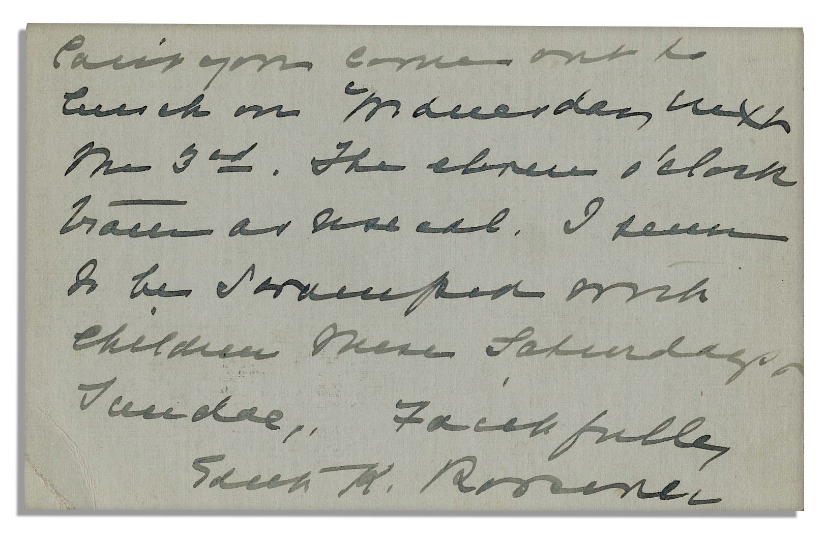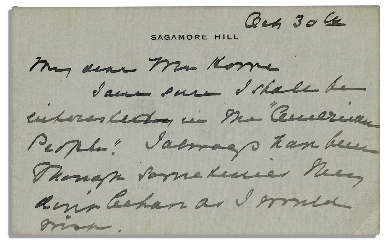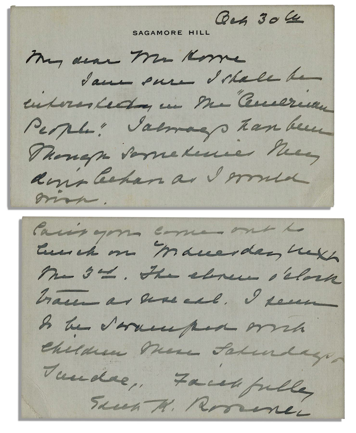 Edith Roosevelt autograph letter signed as Theodore Roosevelt's widow, circa 1924-27. The First Lady writes on the stationery of her estate Sagamore Hill, where she spent most of her time following the deaths of her son and husband. Letter to Will D. Howe reads in part, ''My dear Mr. Howe / I am sure I shall be interested in the 'American People'. I always have been...Edith K. Roosevelt''. Written on both sides of the 5'' x 3.25'' card. Near fine.