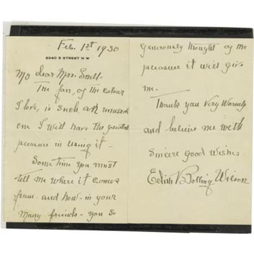 <B>First Lady Edith Wilson Autograph Letter Signed, </B></I> “<I>Edith Bolling Wilson</B></I>”, two pages, 4.25” x 6.25”, Washington, D.C., February 1, 1930, to a Mrs. Frank Hiram Snell, location unknown. Mrs. Wilson here thanks Mrs. Snell for the present of a fan. With original envelope. Large, bold signature. Fine condition.<BR>Edith Wilson (1872 - 1961) was President Wilson's second wife. From 1915 until her husband's untimely death, she was his tireless partner in government. Some historians consider her the <I>de facto</B></I> president during the final months of the Wilson Administration.<BR><BR><b>Shipping:</b> Flat Material, Small (<a target="_blank" href="http://www.heritageauctions.com/common/shipping.php">view shipping information</a>)
