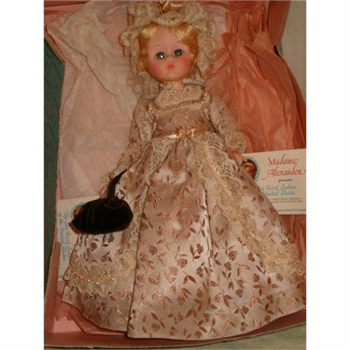 MADAME ALEXANDER'S Martha Washington, First Lady Doll on stand. MINT and Boxed (box is rough from storage). A sweet, amiable woman who was an elegant and dainty matron. First Lady to President George Washington from 1789 to 1797.Sleep eyes, 14 inches tall, gold brocade dress and cap complete with her pantaloons and satin slippers and black purse. A wonderful addition to your doll collection