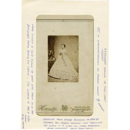 <B>First Lady Mary Todd Lincoln Cabinet Card.</B></I> 4.25” x 6”, Handy, Washington, D. C. studio mark on the lower photo mount, light toning to mount, image slightly faded, else near fine. Mrs. Lincoln might possibly be wearing her inaugural gown in this lovely image. <BR><BR><b>Shipping:</b> Flat Material, Small (<a target="_blank" href="http://www.heritageauctions.com/common/shipping.php">view shipping information</a>)