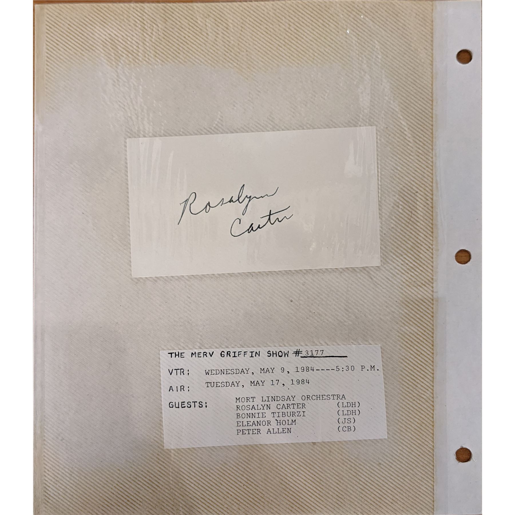 First Lady Rosalynn Carter Signature Cut. Signed backstage at The Merv Griffin Show. 1980's. 3x5 inches.