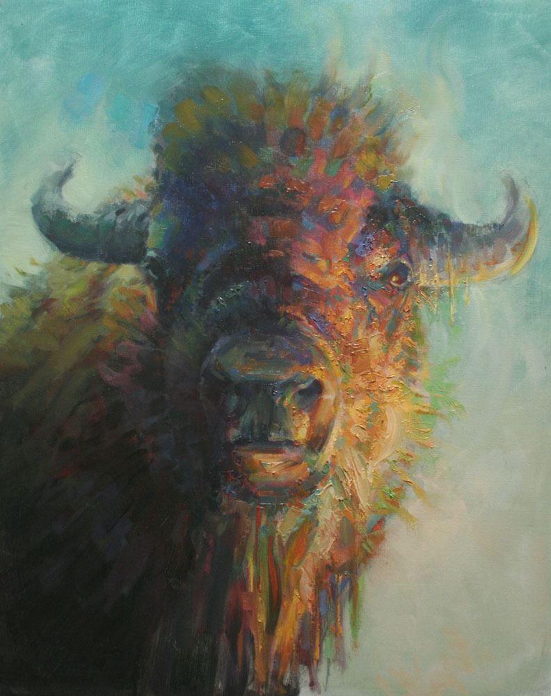 Artist: Robert Krogle. Title: First Light. Size: 30" x 24". Medium: Oil on canvas. Description: The first morning light illuminates the raw features of an American Buffalo
