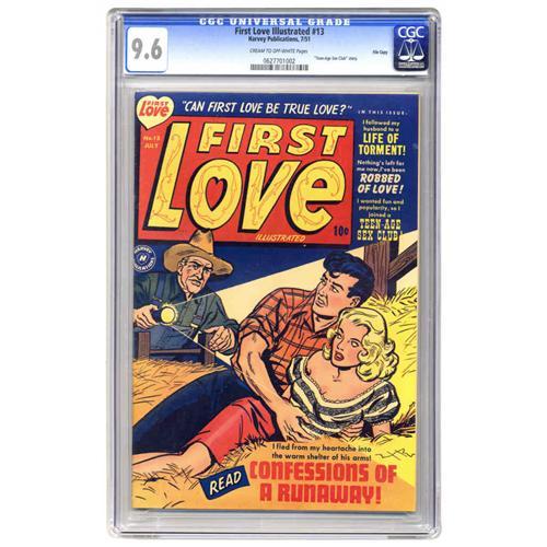 <B>First Love Illustrated #13 File Copy (Harvey, 1951) CGC NM+ 9.6 Cream to off-white pages.</B></I> "I Joined A Teen-Age Sex Club" is simply one of the most entertaining and collectible romance stories ever printed! We won't give away too much of the tale (drawn by Bob Powell) except to note that it contains the line "Put on something slinky and come over to the club tonight, darling, let's see how the boys take to you!" There's also Jay Disbrow art in the issue, and the great cover's by the underappreciated Al Avison. The Guide value for this gem strikes us as ridiculously low -- don't pass up the chance to own this issue, and a 9.6 file copy at that. Overstreet 2005 NM- 9.2 value = $48. CGC census 12/05: 1 in 9.6, none higher.