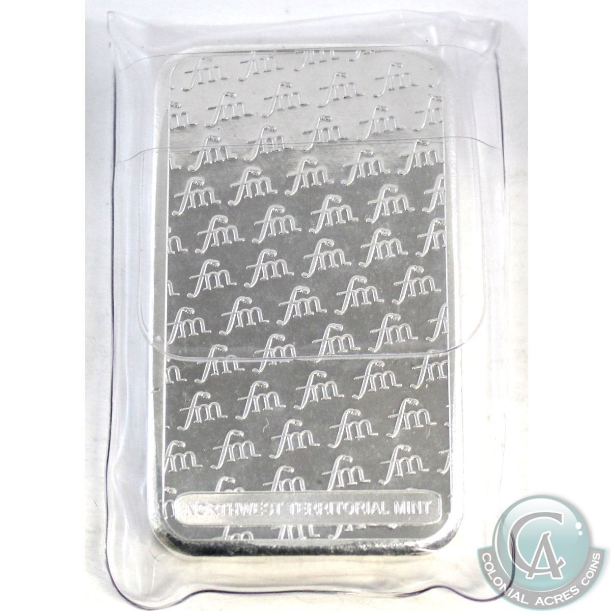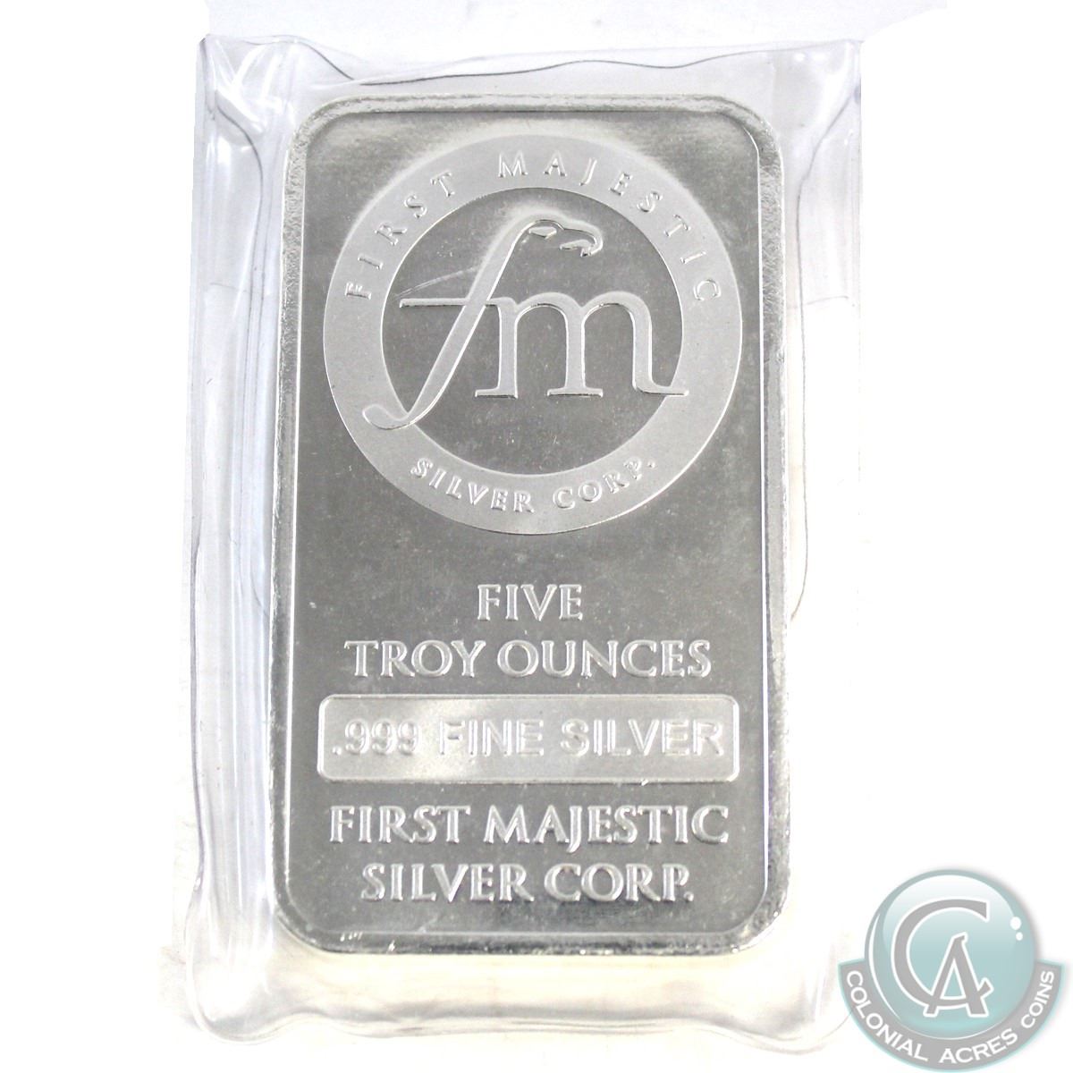 First Majestic "fm" 5 oz .999 Fine Silver Bar (TAX Exempt). With repeated FM logo on the reverse.