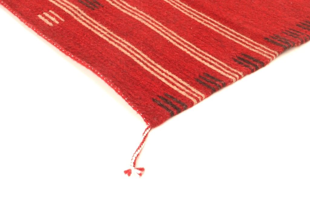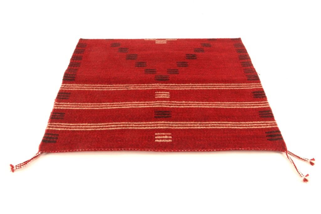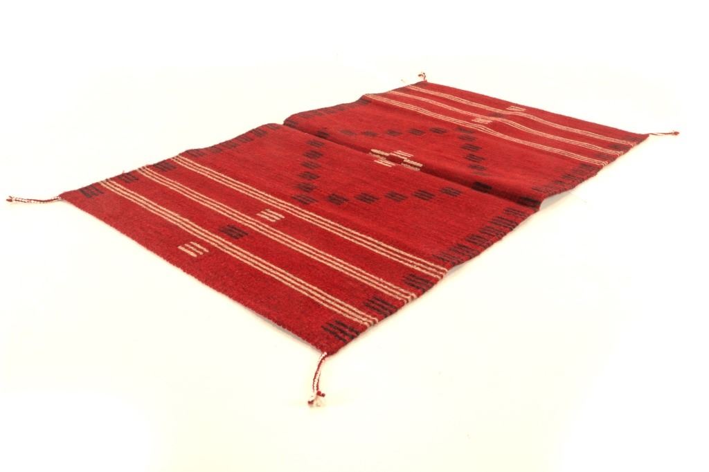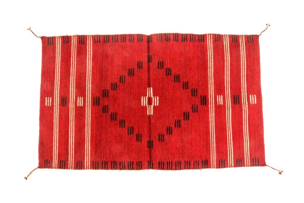 This is an excellent hand woven flat weave rug by master weaver, Pedro Gutierrez. The rug was made using 100% soft, fine, hand spun wool yarns in a beautiful First Mesa Toadlena pattern. The rug was hand woven with a tight weave using 100% hand spun wool yarns that offer natural variegation and durability with color fast aniline dyes. The tight, hand woven weave, displayed with natural fleece tones, is in the fine First Mesa Toadlena pattern of the time-honored Zapotec, multi-generational craft by a master weaver, Pedro Gutierrez. This rug shows iconic Zapotec design with thick, symmetrical decoration. The rug shows a phenomenal 1920s antique style, Toadlena or Two Grey Hills Navajo-like pattern with a modern twist, showing a central diamond pattern with a heathered dark brown background, three bar bands, and border. This is a styling of a Chief’s Blanket, all in colors of light and dark brown with a red field. The piece is brand new, in pristine condition, with a fine, tight weave. The rug measures 2’ by 3’ (2 foot by 3 foot). This is a brand new rug.