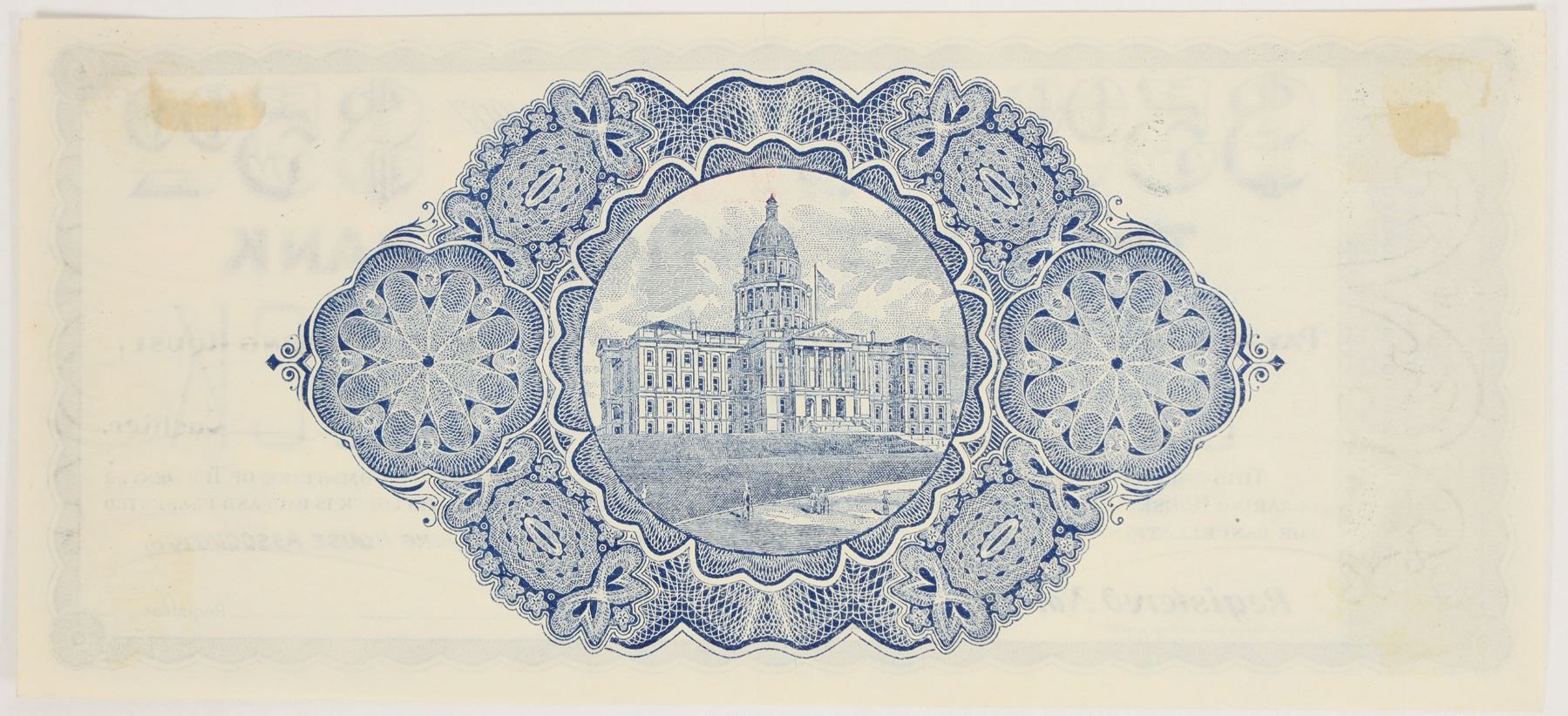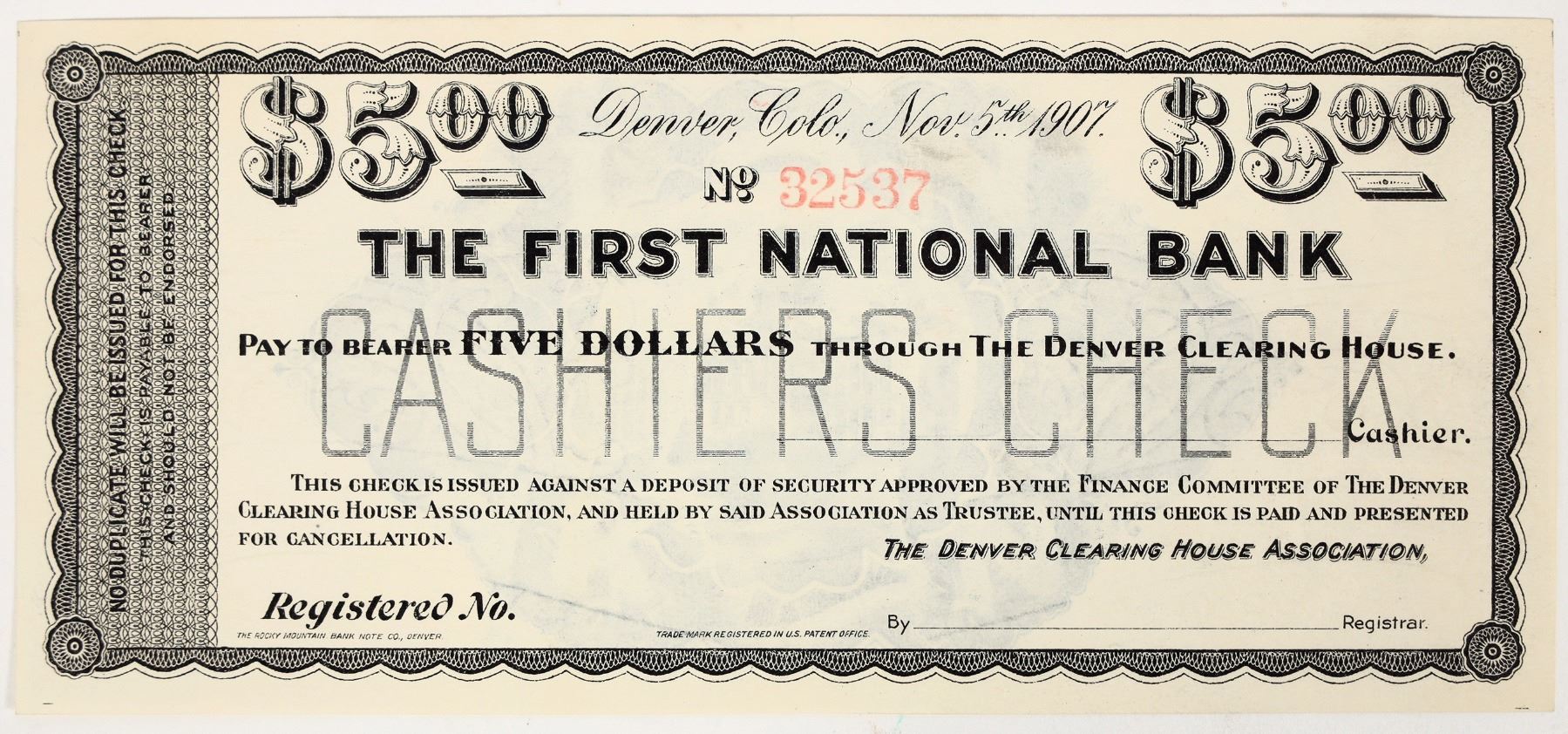 First National Bank, Denver, $5 Depression Scrip, 1907. This unissued bearer note is a cashier's check meant to circulate as currency. Because the "panic" was short-lived, few of these notes were issued. Very scarce. 3.5 x 7.25"