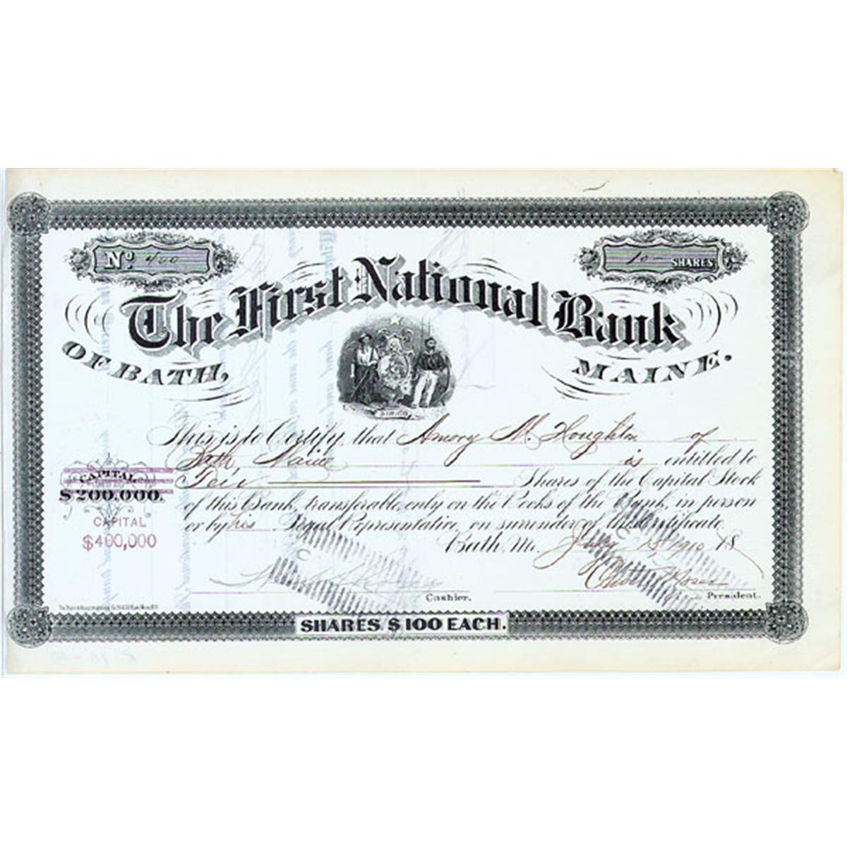 1910, Maine. Stock certificate for 10 shares. Black. Stamp cancelled and very fine.