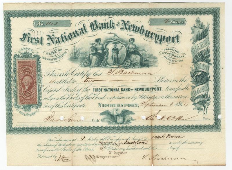 1864, Massachusetts. Stock certificate for 2 shares. Green. Vignette of seated female allegorical figures at top center. Revenue stamp at left side. Punch cancelled. Very fine.
