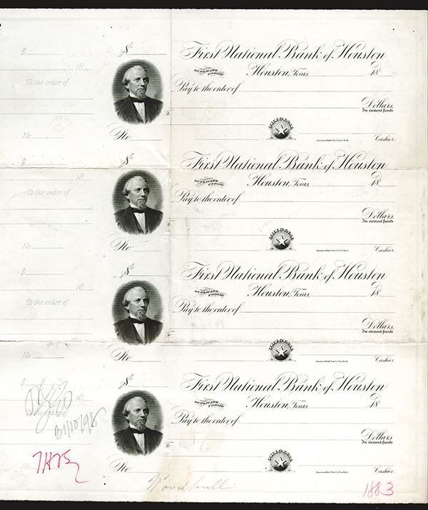 Houston, Texas. Unique approval proof sheet of 4 drafts or checks printed on light card. Vignette of notable on left with "Star of Texas" arms on bottom. 1 vertical fold and 2 horizontal folds. Fine condition. Rare early Texas National bank item. ABNC (ex-ABNC-Christies June 1991 Auction)