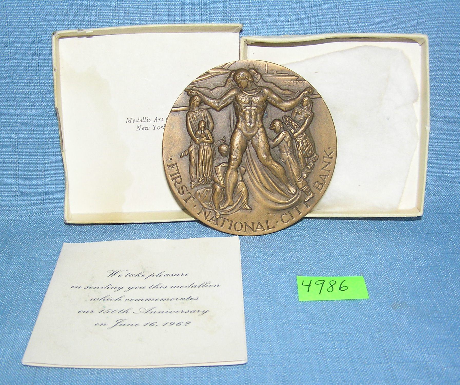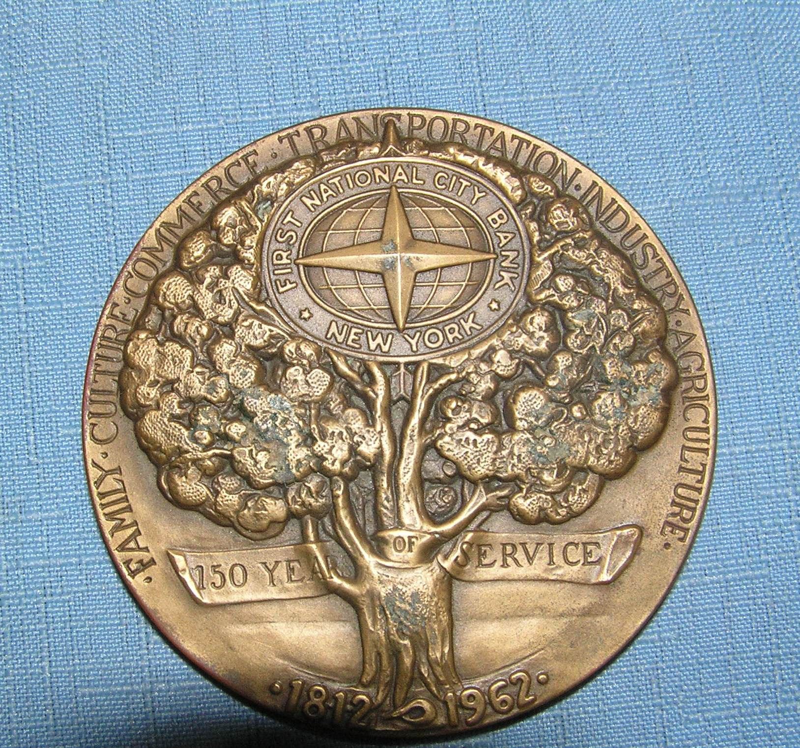 First National Bank of New York Bank solid bronze medallion celebrating 150 years of service profuced by the Medallic Art Company with original box and booklet est. value $200.00-$225.00