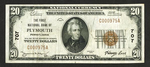 Plymouth, PA. $20, Type 1, Issued banknote, Jones | Woods signatures, S/N C000975A, VF to Choice VF. 11 Large and 39 Small notes known on this bank with five $20, 1929, T1 nationals known on this bank. This note may very well be close to finest known.