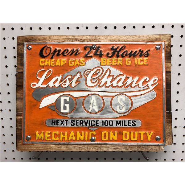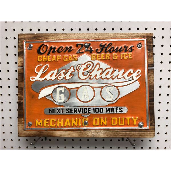 Nostalgic tin on wood plank sign "Last Chance Gas Next Service 100 Miles" - 15 1/2in x 11 3/4in