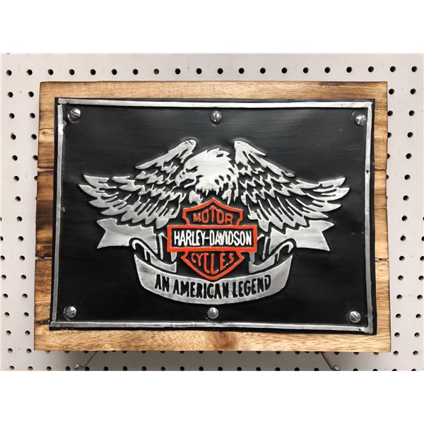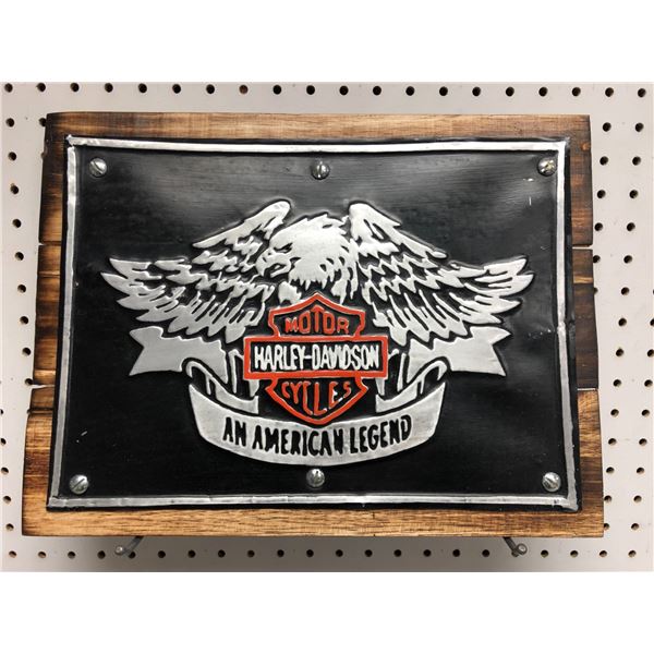 Nostalgic tin on wood plank sign "Motor Harley-Davidson Cycles An American Legend" - 15 1/2in x 11 1