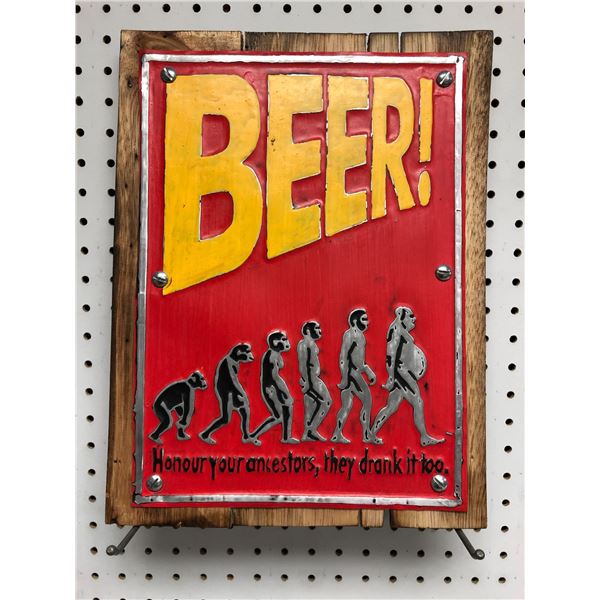 Nostalgic tin on wood plank sign "Beer!" - 11 1/2in x 15 1/2in