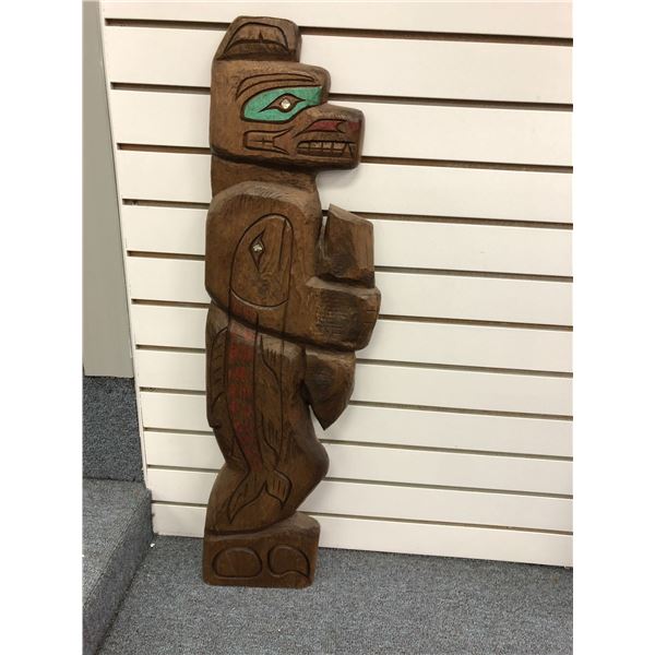 33in West Coast First Nations wood carving w/ abalone eyes "Bear & Salmon" signed Telqua 1998