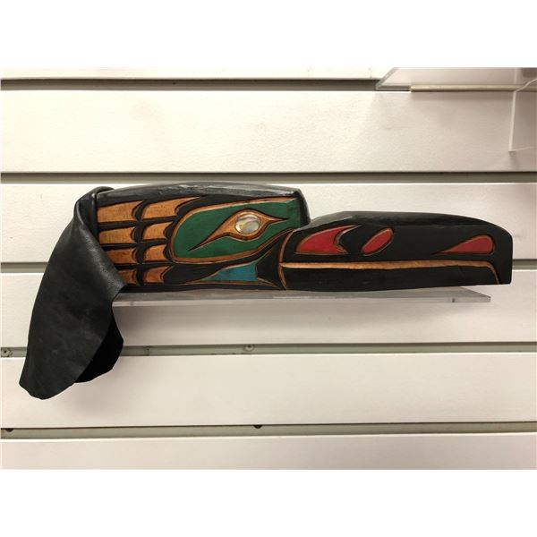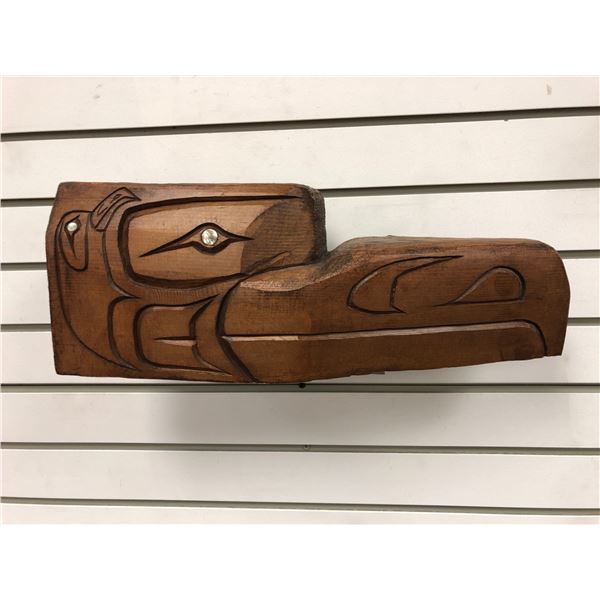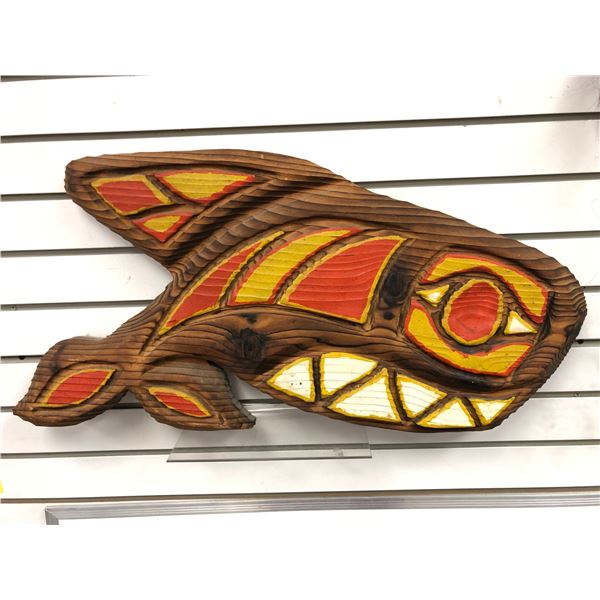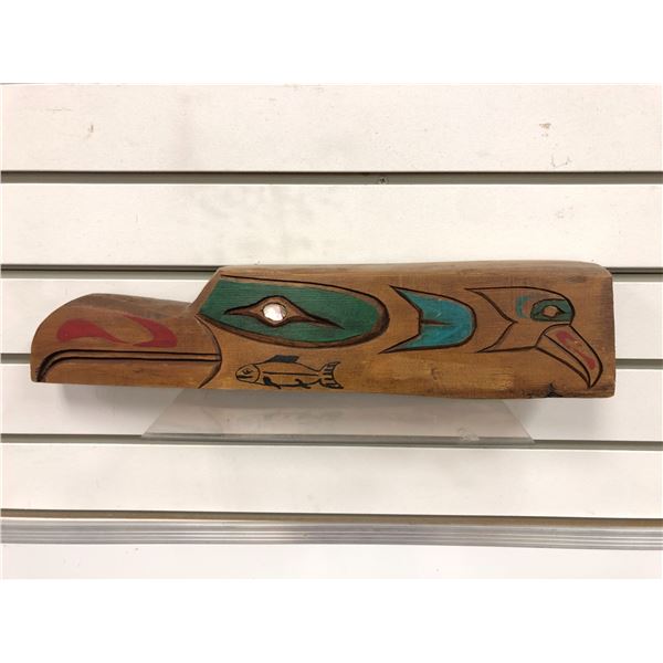 12in x 25in Wingspan West Coast First Nations carved "Raven & Salmon" wood carving w/ abalone eyes s