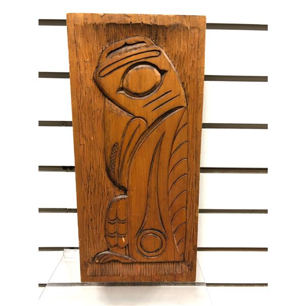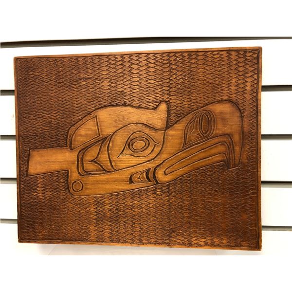 22in x 18in West Coast First Nations "Chickadee" by Glen Rabene wood carving on plank - approx. 22in