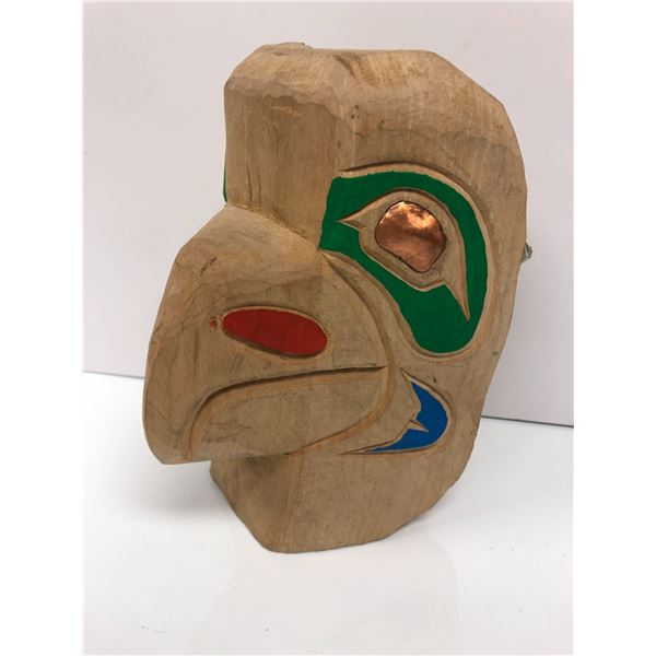 9in West Coast First Nations carved wooden "Eagle" mask w/ copper eyes signed Telqua 1999