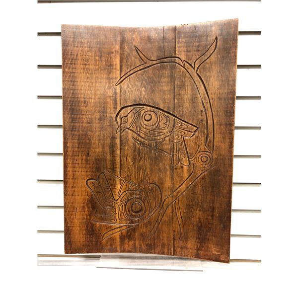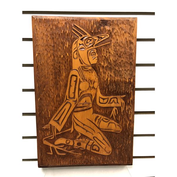14 3/4in x 11 3/4in West Coast First Nations carved yellow cedar plank signed J Kelder