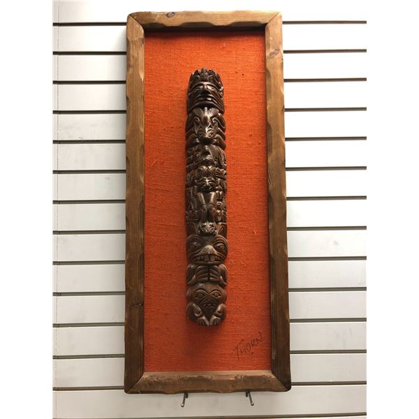 Framed West Coast First Nations carved cedar "Strongman" totem signed Thorn - approx. 15in x 36in