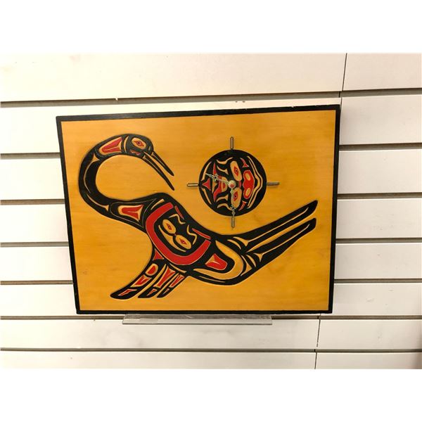 West Coast First Nations carved yellow cedar plank wall clock - 15 1/2in x 12in (unsigned)