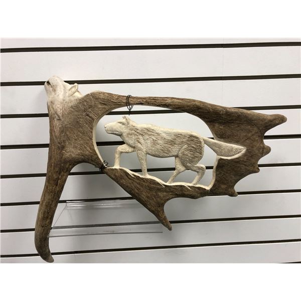 Rare "Wolf" carving on moose antler signed by T.Page Sept 30th 2004 from movie set