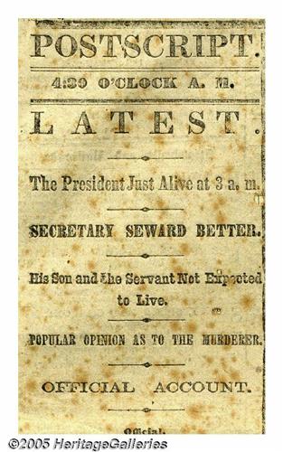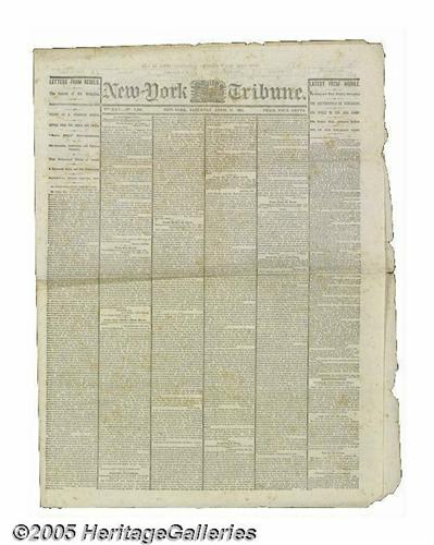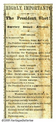 <B>First News of President Abraham Lincoln's Assassination</B></I> Fine, uncut copy of the Saturday, April 15, 1865 edition of the <I>New York Tribune.</B></I> This is the 4:20 a.m. edition that has reports of Lincoln's assassination on pages two and four. When this paper was hastily run off, the President was still alive, as reported on page four, although his expected death prompted the addition of black mourning columns. The situation at the time was chaotic and erroneous reports (such as the death of Secretary Seward and his son) circulated widely. This is a particularly fine copy of a truly historic newspaper. Lot:258