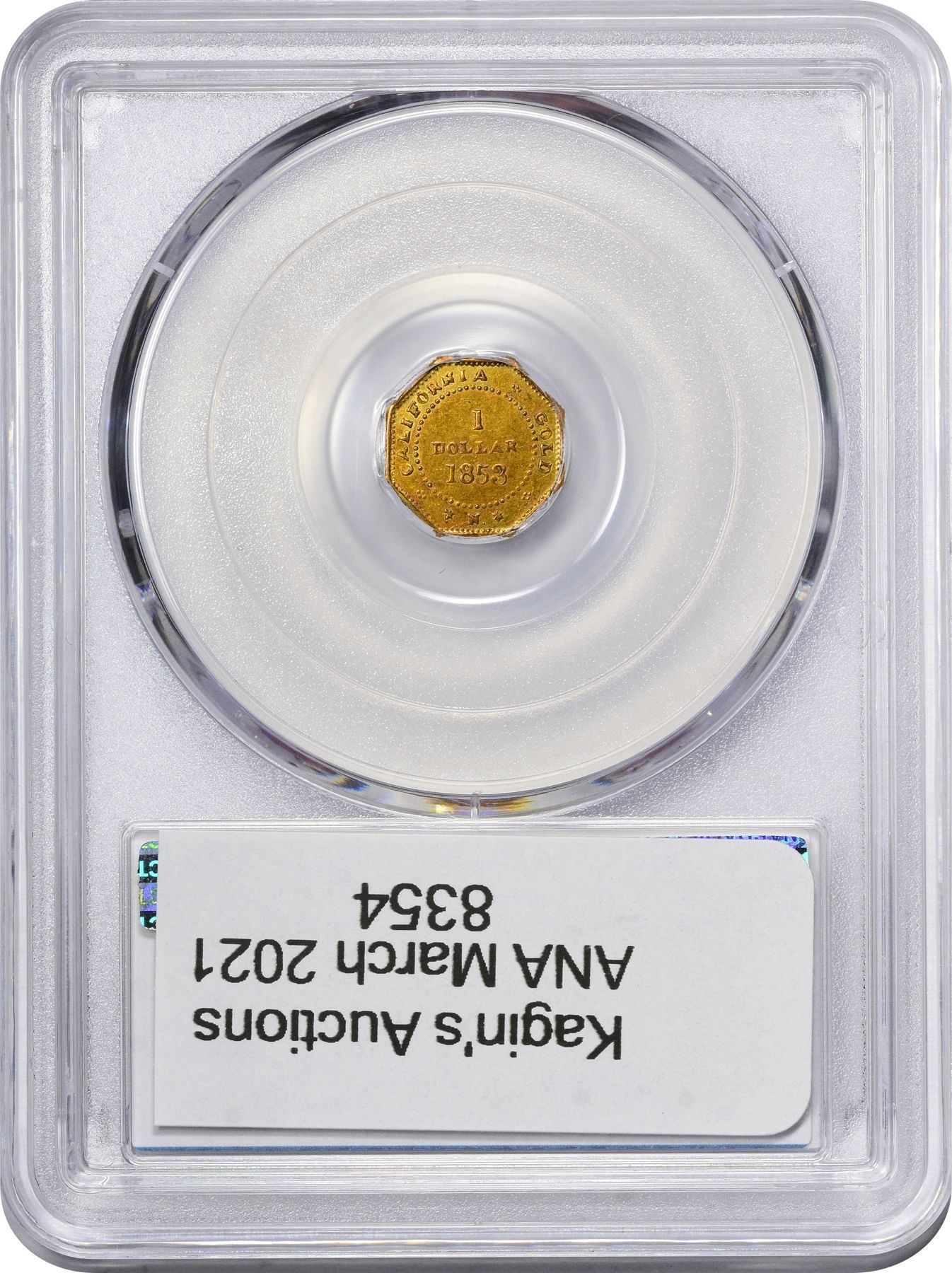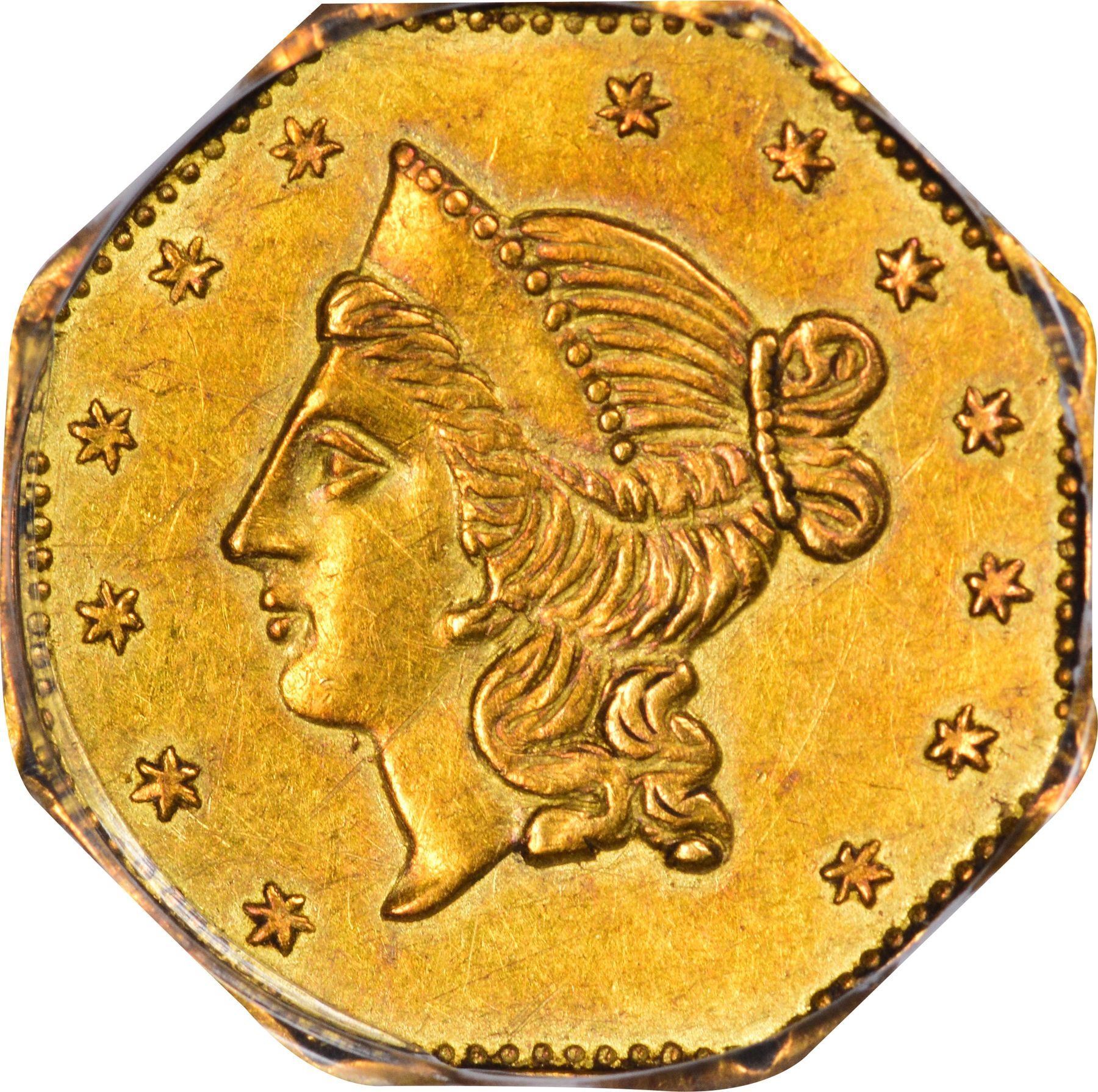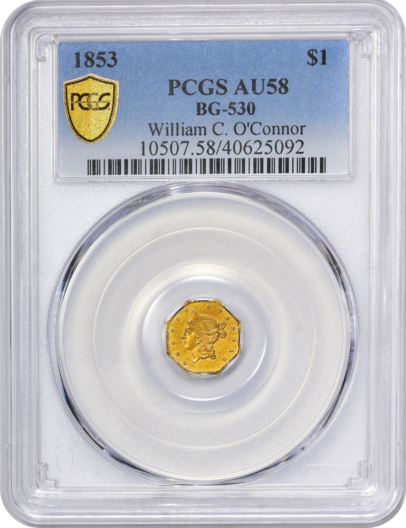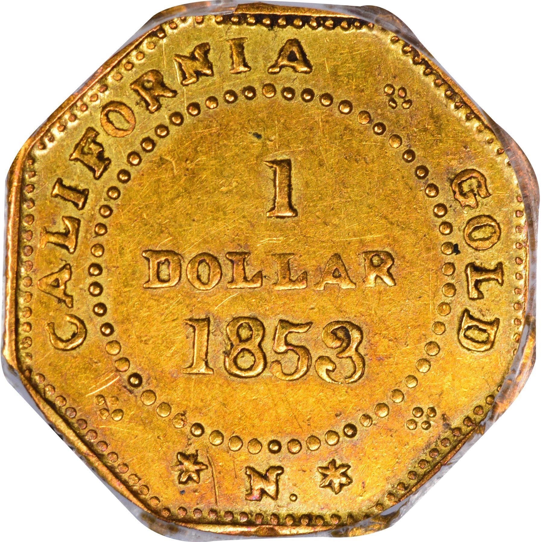 Description: 1853 N. octagonal 1 Dollar, BG-530. PCGS AU58. A large number of these were certainly issued in 1853, because 15 or 16 of them were recovered from the wreck of the S.S. Winfield Scott, which sailed December 1, 1853. Signed by Antoine Louis Nouizillet. Liberty head as on Nouizillet’s octagonal and round half dollars, 13 stars around, divided 6 + 7; (ornament) CALIFORNIA (ornament) GOLD (ornament) around 1/ DOLLAR/ 1853, N. below. Sharply struck, dull gold color, lightly toned around periphery. PCGS AU58 William C. O’Connor (PCGS# 10507).