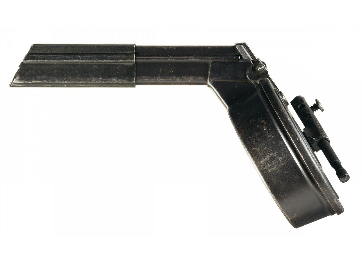 Outfitted with the early telescoping winding lever, with the serial number "60551" on the unribbed top and lightly ribbed bottom, a makers mark of 3 small hexagons inside a larger hexagon on the bottom, "backwards J" and "E B" on the side of the lever and "GERMANY" on the bottom. The hexagonal proof is associated with AEG (Allgemeine Elektricitaets-Gesellschaft, or General Electric Company), a Berlin firm that chiefly produced electrical equipment, but also manufactured military equipment such as multi-engine tactical bombers. The bottom also has the cartridge counter markings around the circumference. With a stamped sheet metal dust cover, also bearing the AEG hexagon stamp.