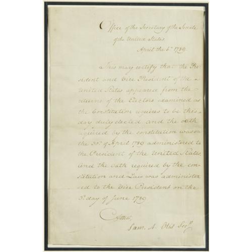 <B>Certification of the first presidential election and the oaths of office by Washington and Adams, 1789</B></I> <BR><BR><B>Samuel A. Otis (1740-1814) statesman, brother of James Otis, important manuscript Document Signed</B></I> "<I>Sam. A. Otis</B></I>" as Secretary of the United States Senate, one page, 9.25" x 14", "<I>Office of the Secretary of the Senate</B></I>" [New York], April 6, 1789 to June 3, 1789. A truly unusual document bearing three dates between April 6 and June 3, 1789 certifying the first United States presidential election and the oaths of office taken by George Washington and John Adams. The document, written in a neat hand by a secretary, reads: <BR><BR>"<I>This may certify that the President and Vice President of the United States appeared from the returns of the Electors examined as the Constitution requires to be this day duly elected, and the oath required by the constitution was on the 30th of April 1780 administered to the President of the United States, and the oath required by the constitution and Law was administered to the Vice President on the 3d day of June 1789.</B></I>" <BR><BR>The document is quite unusual in that it appears to have been prepared over a period of time: namely April 6 to June 3, 1789. David Mearns, late Chief of Manuscripts Division at the Library of Congress, wrote on this piece in 1955: "April 6th, the date at the head of the document, was indeed the date on which the Secretary of the Senate certified that the President and Vice-President were elected. April 30th was the date on Washington took the oath; and June 3rd was the date on which Adams was sworn in. This particular document, then, is apparently a summary-type certification... I think the periods (or seeming periods), which follow the words 'elected1' and 'States,1' might indicate that the document was in the process of preparation over a two-month period." <BR><BR>The electoral college had voted on February 4, 1789, unanimously electing George Washington first President under the Constitution. John Adams, however, won the Vice Presidency only by a plurality (garnering 34 of 69 possible votes). Although the outgoing Continental Congress had set the 4th of March as the date for convening for the first United States Congress, members took some time to reach New York. The House of Representatives was unable to reach a quorum until April 1, 1789 and the Senate, April 6. On the latter date, the two houses met jointly and opened to count the electoral vote declaring Washington and Adams elected: hence the initial dateline on the document. Samuel Otis himself was not elected Secretary of the Senate until April 8; Adams appeared in the Senate Chamber to assume his duties on April 21 and Washington would enter New York triumphantly at take the oath of office in a public ceremony at Federal Hall on April 30, 1789. <BR><BR>Why this document was prepared is open to speculation and it is not entirely certain whether it was prepared over a two-month period, or a very accurate copy of another document (as the odd periods were faithfully noted). If the latter explanation is true, then it may have been a draft destined to a state governor as was the custom with acts of Congress during the confederation period. This particular issue may have been an extra copy that was never sent though we don't know of any similar documents appearing in any state collections. It would not have been for the use of the government as all of this information would have been entered into the Senate and House journals. Notifications of acts of Congress were normally printed and distributed to the governors of the several states by the Secretary of State. The early weeks of both houses of Congress were spent drafting rules and procedures so formal documents like these had very little precedent. No document like this is mentioned in the Senate Journal. Thus this makes this a truly unusual and important piece.