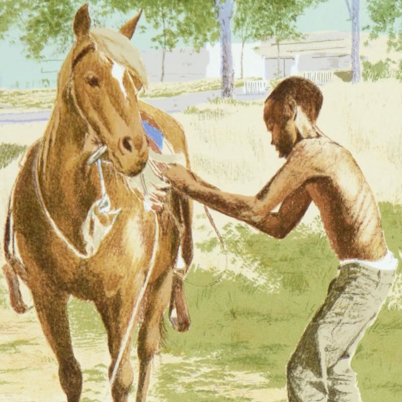 "First Ride" is a limited edition serigraph on paper by William Nelson, numbered and hand signed by the artist! Measures approx. 28.5" x 21.5" (with border); 25" x 18" (image).