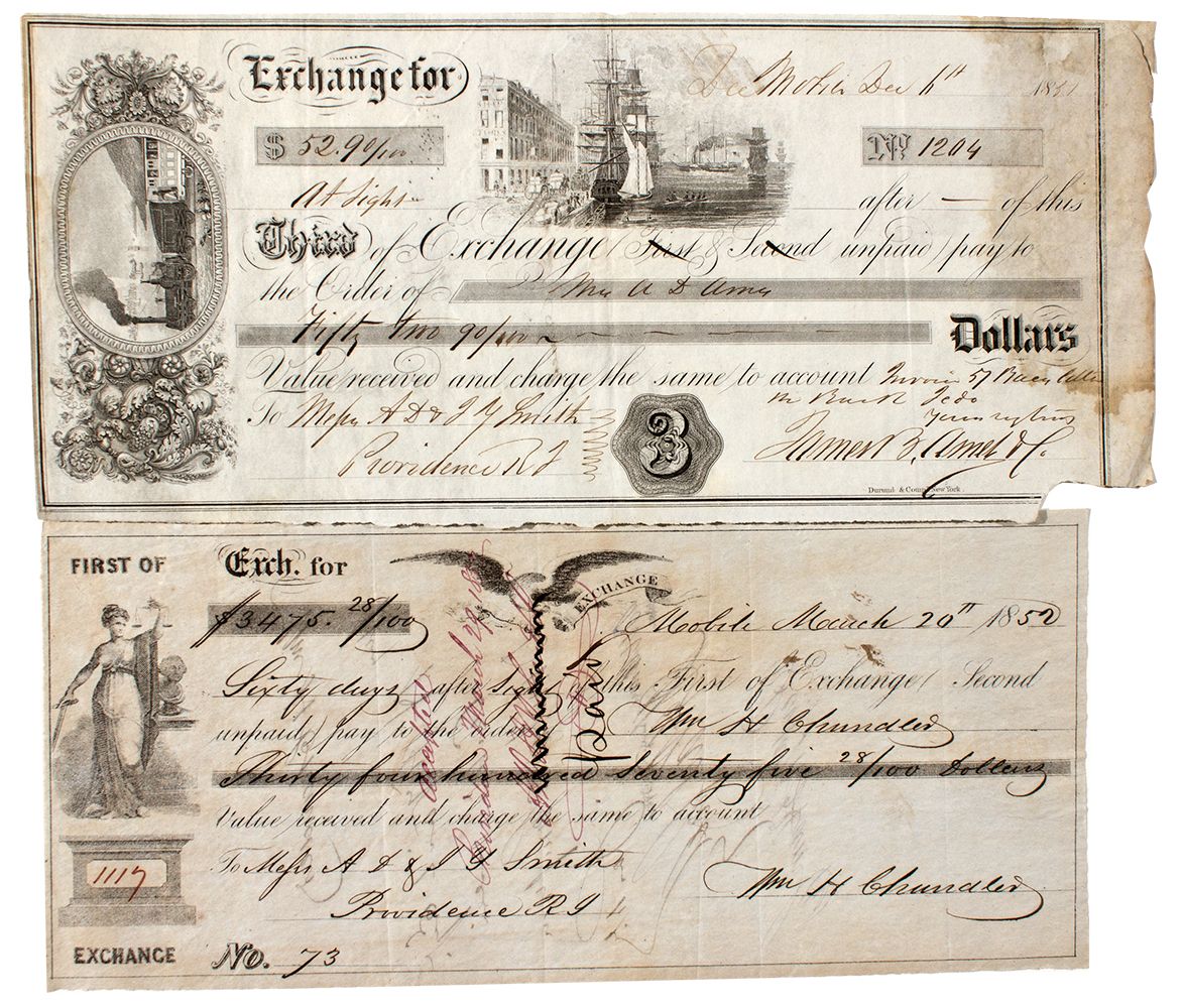 1851 Lot of two includes 1.) First of Exchange No.73 signed by William H. Chandler payable in Providence, RI for $3475.28. Dated Mar. 20, 1852 Allegorical vignette of Lady Liberty at left. Very Fine. 2.) Third of Exchange No.1204 signed by James B. Ames & Co. payable in Providence, RI for $52.90. Dated Dec 6, 1851. Vignette at top center of detailed line drawing of Clipper ship at port and second vignette at left of an early steam train. Chip to lower right and stain along right edge. Otherwise, the condition is Very Fine. Provenance HKA The Rush For Gold, 2008. - HKA#64820